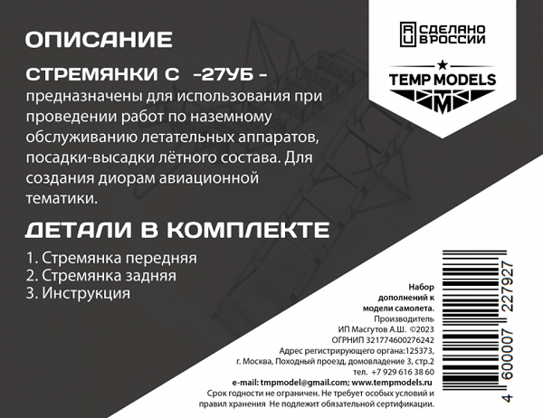 Описание СТРЕМЯНКА С-27УБ - предназначена для использования при проведении работ по наземному обслуживанию летательных аппаратов, посадки-высадки летного состава. Для создания диорам авиационной тематики.