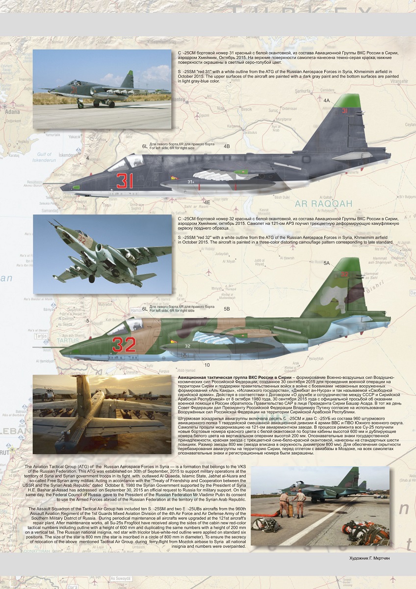 Описание В наборе представлены декали с опознавательными знаками С-25 ВВС ВКС России, участвовавшими в военных операциях на территории Сирии в войне с Исламским государством.