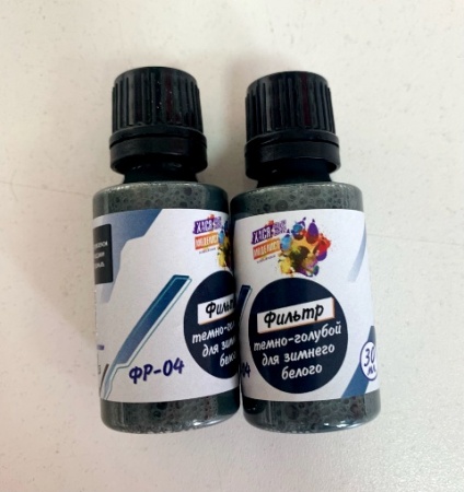 Модельная химия от Российского производителя "Хася моделист". Серия жидкостей-фильтров на базе уайт-спирита для сборных моделей. Перед нанесением хорошо взболтать. Фильтр темно-голубой для зимнего белого, 30 мл.