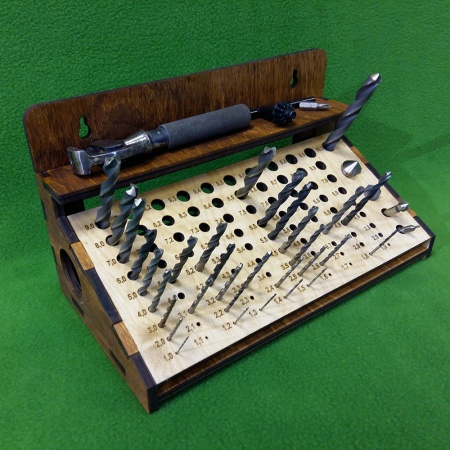 Сборная подставка для сверл диаметрами от 1 до 10 мм с шагом 0,1 мм. Все сверла имеют подписанные ячейки, благодаря чему никогда не потеряются. Органайзер собирается всего из 6-ти деталей, вырезанных из фанеры толщиной 6 мм. Подставка может стоять на столе, или крепиться на стену - для этого предусмотрены отверстия-подвесы. Есть небольшая полочка для дополнительного инструмента, скажем, для ключа от сверлильного патрона.