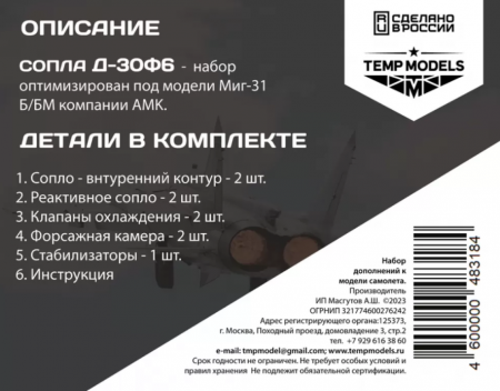 MP СОПЛА РЕАКТИВНОГО ДВИГАТЕЛЯ Д-30Ф6 ДЛЯ МИГ-31 (1/48) продается в 1 магазинах. Выберите подходящий Вам интернет-магазин и перейдите по ссылке «В магазин».