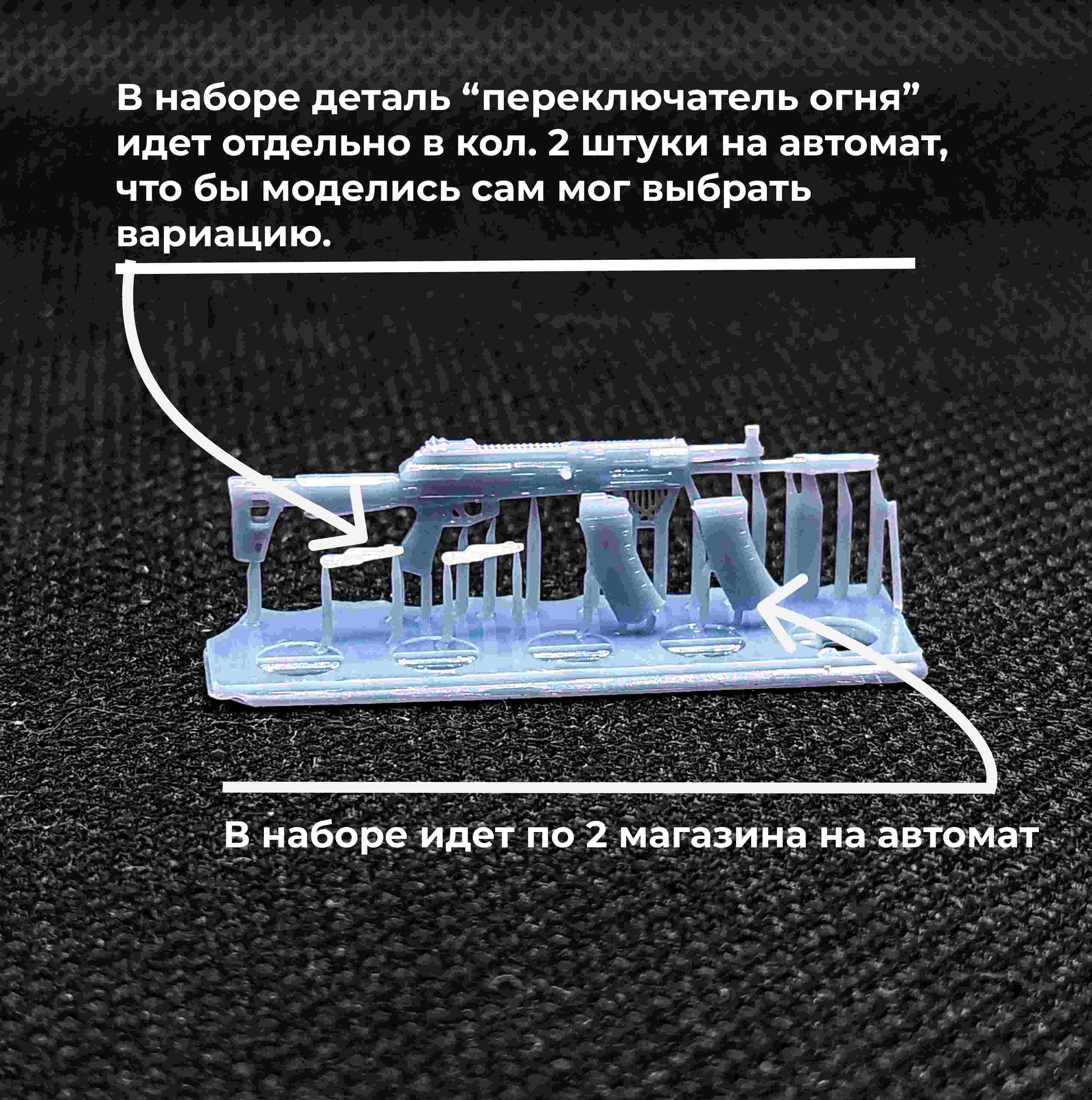 Описание Модели выполнены в 35м масштабе - самом распространенном масштабе для военно-исторических моделей. В наборе идет 5 штук моделей автомата, к каждому автомату идет по 2 переключателя огня, где один запасной в случае потери столь мелкой детали, и по 2 магазина один для крепления к автомату, а второй несет декоративную функцию. Переключатель огня идет отдельной деталью, что бы моделист мог сам выбрать какой выставить режим огня на миниатюре, исходя из своей задумки исполнения. Модели произведены из фотополимерной смолы серого цвета с высокой степенью детализации. Модели поставляются в разобранном виде на поддержках для лучшей сохранности при транспортировке и неокрашенные. (Клей и краски не входят в набор) Склейка производится цианакрилатным клеем (монолит/секундный/супер клей/космофен). Клей и краски не входят в комплект.