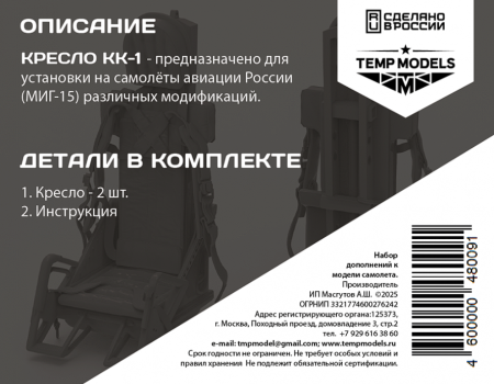 КРЕСЛО КК-1 - предназначено для установки на самолёты авиации России (МИГ-15) различных модификаций.