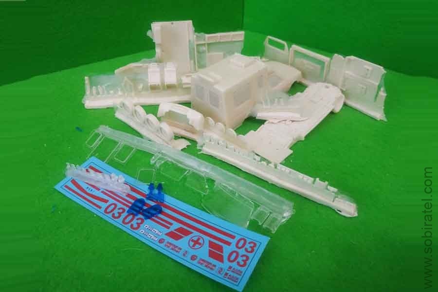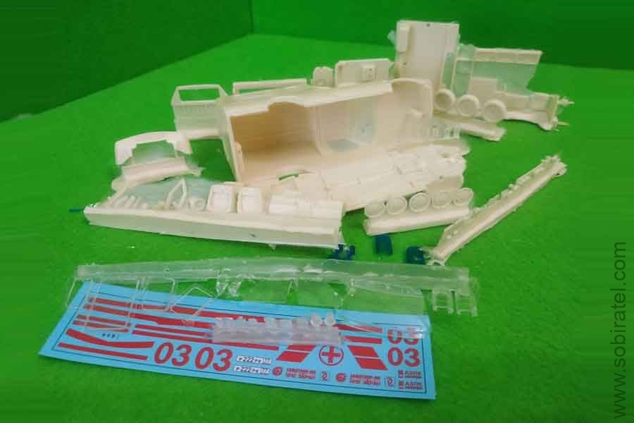 Набор для доработки масштабной модели в масштабе 1/43. Сделан из жидкого литьевого пластика на основе полимеров. Легко обрабатывается абразивными материалами (надфиль, наждачная бумага, канцелярский нож). Устойчив к ультрафиолету. Цвет материала может отличаться от изображения. Детали поставляются не обработанными (как на фото) и без остекления, возможны вкрапления воздушных пузырьков, которые без труда шпаклюются. Донор - модель: Не требуется. В комплект входит всё необходимое для сборки модели. Описание и изображение производителя