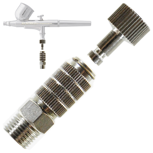 Быстроразъёмная муфта Jas 3001 муфта для аэрографа, которая одной стороной прикручивается к шлангу со стандартной гайкой 1/8 дюйма, а второй к воздушной кисти с штуцером 1/8 дюйма. Это позволяет легко отсоединять и присоединять аэрограф. Муфту удобно использовать при смене аэрографа или в любых других случаях, когда нужно быстро отсоединить инструмент от шланга.