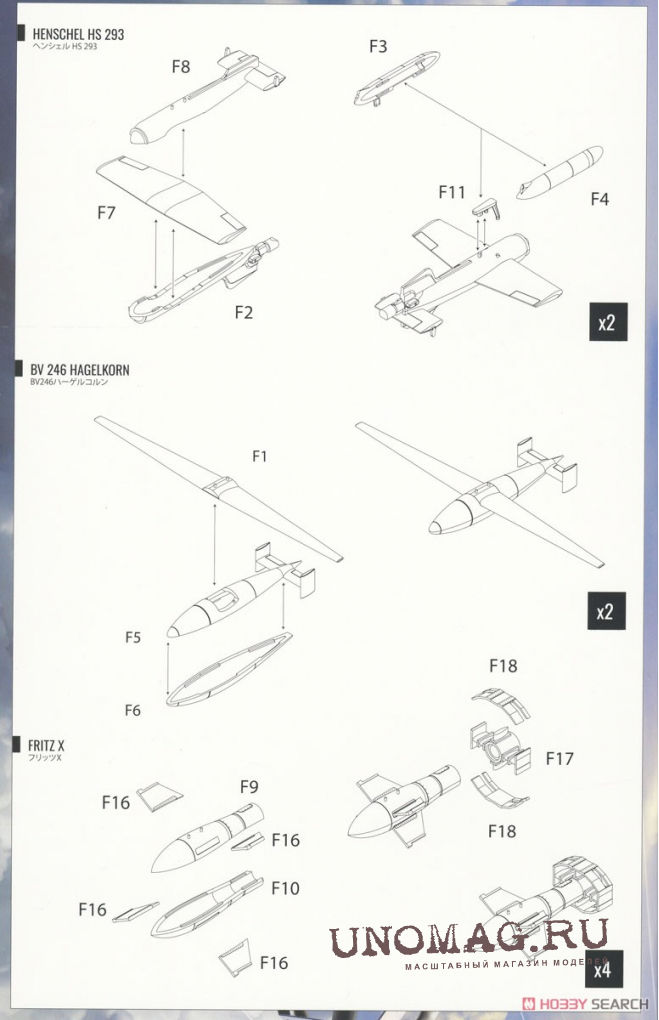 GERMAN LUFTWAFFE WEAPON SET 3 BV 246 HAGELKORN (2PCS), FRITZ X (4PCS), HENSCHEL HS 293 (2PCS) (1/72) продается в 1 магазинах. Выберите подходящий Вам интернет-магазин и перейдите по ссылке «В магазин».