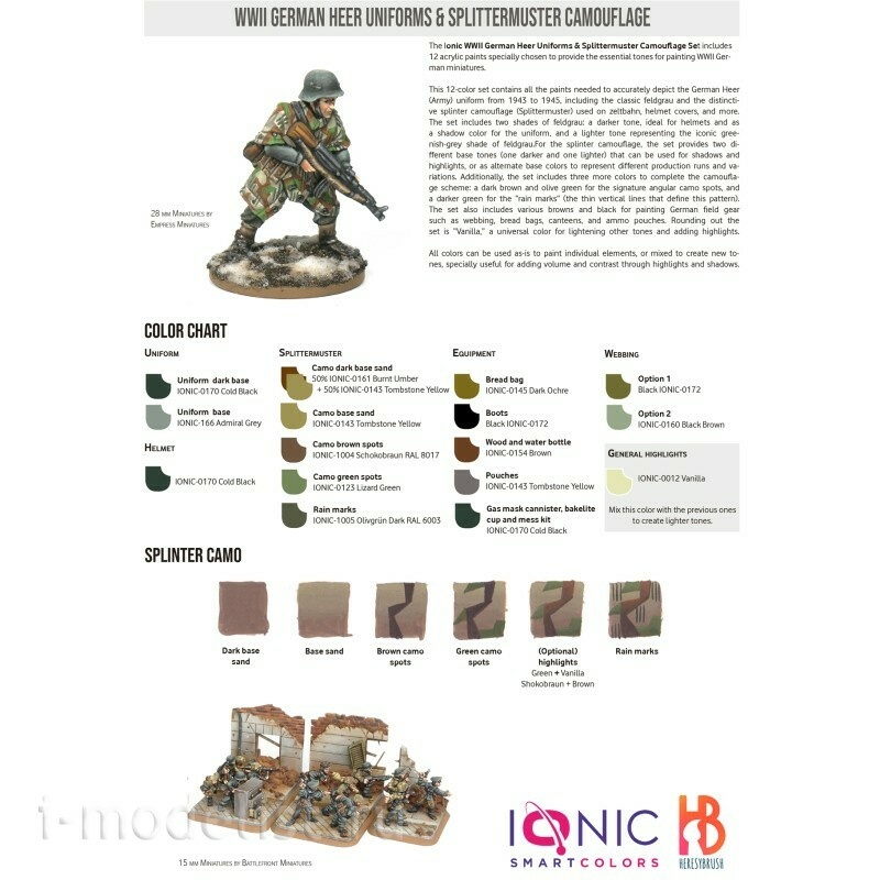 Дополнительная информация 12 х 20 мл акриловых красок. В набор входят 12 акриловых красок, специально подобранных для создания необходимых тонов для рисования немецких миниатюр времен Второй мировой войны. Этот набор из 12 цветов содержит все краски, необходимые для точного изображения немецкой военной формы с 1943 по 1945 год, включая классическую форму фельдграу и отличительный камуфляж Splintermuster, который использовался на zeltbahn, чехлы для шлемов и многое другое. В комплект входят два оттенка фельдграу: более темный, идеально подходящий для шлемов и в качестве оттенка теней для униформы, и более светлый, представляющий культовый зеленовато-серый оттенок фельдграу. Для камуфляжа splinter в наборе предусмотрены два разных базовых тона один более темный, другой более светлый, которые можно использовать для создания теней и бликов, а также в качестве альтернативных базовых цветов для представления различных серий и вариаций. Кроме того, в комплект входят еще три цвета для завершения камуфляжной схемы: темнокоричневый и оливково-зеленый для характерных угловатых пятен камуфляжа и более темный зеленый для “следов дождя” - тонких вертикальных линий, которые определяют этот узор. В набор также входят различные коричневые и черные тона для окраски немецкого полевого снаряжения, такого как лямки, мешки для хлеба, фляги и подсумки для боеприпасов. Завершает набор универсальный цвет “Ваниль”, который позволяет осветлить другие тона и добавить изюминки. Все цвета можно использовать как есть для раскрашивания отдельных элементов или смешивать для создания новых тонов, что особенно полезно для придания объема и контраста с помощью бликов и теней. В набор входит: IONIC-0170 Cold Black IONIC-166 Admiral Grey IONIC-0161 Burnt Umber IONIC-0143 Tombstone Yellow IONIC-1004 Schokobraun RAL 8017 IONIC-1005 Olivgrün Dark RAL 6003 IONIC-0123 Lizard Green IONIC-0154 Brown IONIC-0145 Dark Ochre IONIC-0160 Black Brown IONIC-0172 Black IONIC-0012 Vanilla