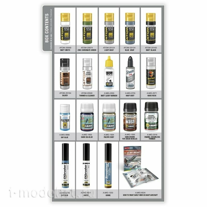 Дополнительная информация С помощью этого набора вы сможете применять наиболее распространенные цвета и эффекты к самолетам ВМС США начала Второй мировой войны. На Тихоокеанском театре военных действий во время Второй мировой войны палубная авиация, как японская, так и американская, сыграла наиболее значительную роль. Начиная с Перл-Харбора и до конца войны, сражения с участием авиации ВМС США и Японии были непрекращающимися. В конце декабря 1940 года военно-морской флот США приказал полностью покрасить все палубные самолеты в светло-серый цвет. Впоследствии, в августе 1941 года, было принято решение о том, что верхние поверхности самолетов, принадлежащих боевым силам Тихоокеанского флота, должны быть окрашены в сине-серый цвет, в то время как нижние поверхности должны были сохранить прежний светло-серый цвет. В последующие месяцы постепенно было принято решение о том, чтобы все больше самолетов было окрашено по этой схеме. К февралю 1942 года было официально приказано, чтобы все самолеты ВМС США, как палубные, так и наземные, были окрашены в сине-серую и светло-серую гамму. Эта первоначальная схема камуфляжа использовалась до января 1943 года, когда для палубной авиации была введена новая трехцветная схема камуфляжа. Верхняя часть была окрашена в синий цвет морской волны, средняя часть - в синий, а нижняя часть - в белый цвет опознавательных знаков. В этом SOLUTION BOX вы найдете не только необходимые краски, лаки и средства для везеринга для окраски любого самолета ВМС США в камуфляж времен Второй мировой войны, включая легендарные F4U Corsair, F4F Wildcat, TBD-1 Devastator, TBF/TBM Avenger, SBD Dauntless и многие другие; в него также входят книга "Ценный ресурс для решения проблем": Как раскрасить самолеты ВМС США времен Второй мировой войны. Это простое 67-страничное руководство содержит пояснительные тексты на четырех языках (английском, испанском, французском и немецком). В качестве примера в этой книге решений используется модель Douglas TBD-1 Devastator в масштабе 1/48 от GWH. SOLUTION BOX - это простая система, с помощью которой вы можете выполнить полный процесс везеринга ваших моделей, включая смывку панелей, фильтры, грязи, разводов и многое другое. Это фантастическая идея для любителей, которые хотят начать заниматься моделированием, или для тех, кто хочет иметь все в одной коробке и не выбирать изделия по отдельности. В набор входит: A.MIG-6534 Solution Book 30: How to Paint EARLY WWII US NAVY AIRCRAFT ATOM-20134 ATOM COLOR Blue Gray ATOM-20124 ATOM COLOR Light Gray ATOM-20074 ATOM COLOR Zinc Chromate Green ATOM-20000 ATOM COLOR Matt White ATOM-20163 ATOM COLOR Matt Black ATOM-20164 ATOM COLOR Silver ATOM-20500 ATOM Thinner & Cleaner 20mL A.MIG-2071 HARD ROCK Glossy Varnish 20ml A.MIG-2055 LUCKY VARNISH Matt 17mL A.MIG-1005 Dark Brown WASH for Green Vehicles A.MIG-0806 ACRYLIC FILTER Sky Blue A.MIG-0755 MATT SHADER Navy Grey A.MIG-1604 PLW Pacific Dust A.MIG-1603 PLW Dark Sea Blue A.MIG-2018 Enamel Odourless Thinner 35mL A.MIG-3528 OILBRUSHER Sky Blue A.MIG-3501 OILBRUSHER White A.MIG-1253 STREAKINGBRUSHER Grime