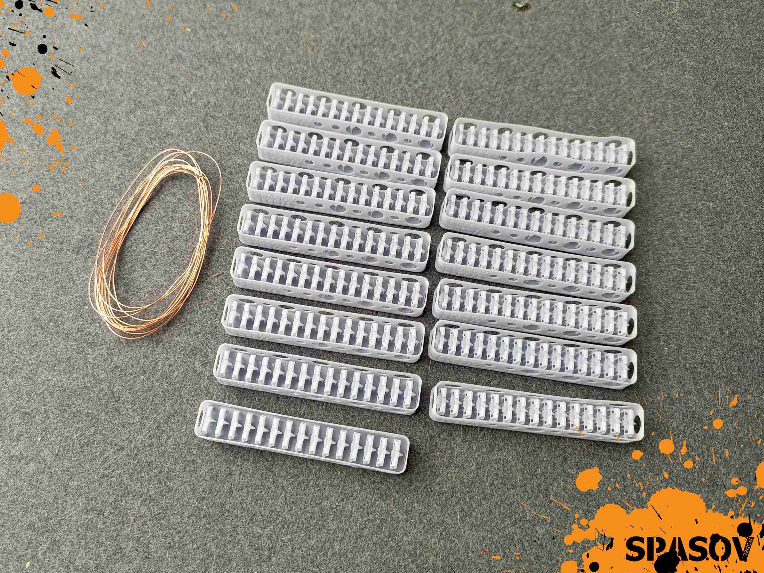 Описание Набор включает 15 отпечаток по 15 траков, общим количеством 225 шт., а также 1,6 метров медной проволоки диаметром 0,3-0,35 мм. На одну гусеничную ленту необходимо использовать 108 шт., количество используемых траков может быть сокращено! Траки собираются на проволоку, для этого необходимо нарезать проволоку входящую в комплект на отрезки равные 7 мм, и аккуратно соединять данными отрезками! Гусеницы подходят для моделей фирмы HobbyBoss, для того чтобы их установить на модели фирмы Звезда необходимо заменить ведущие колеса на наши 3566 Ведущее колесо Т-26 (раннего типа) или 3567 Ведущее колесо Т-26 (позднего типа), так как колеса идущие в комплекте немного шире по венцам!
