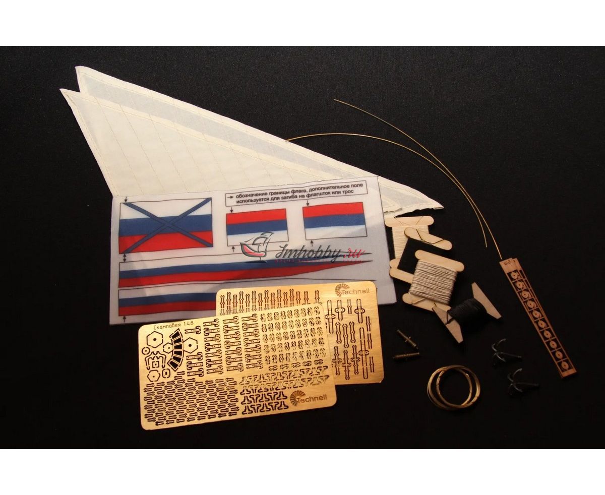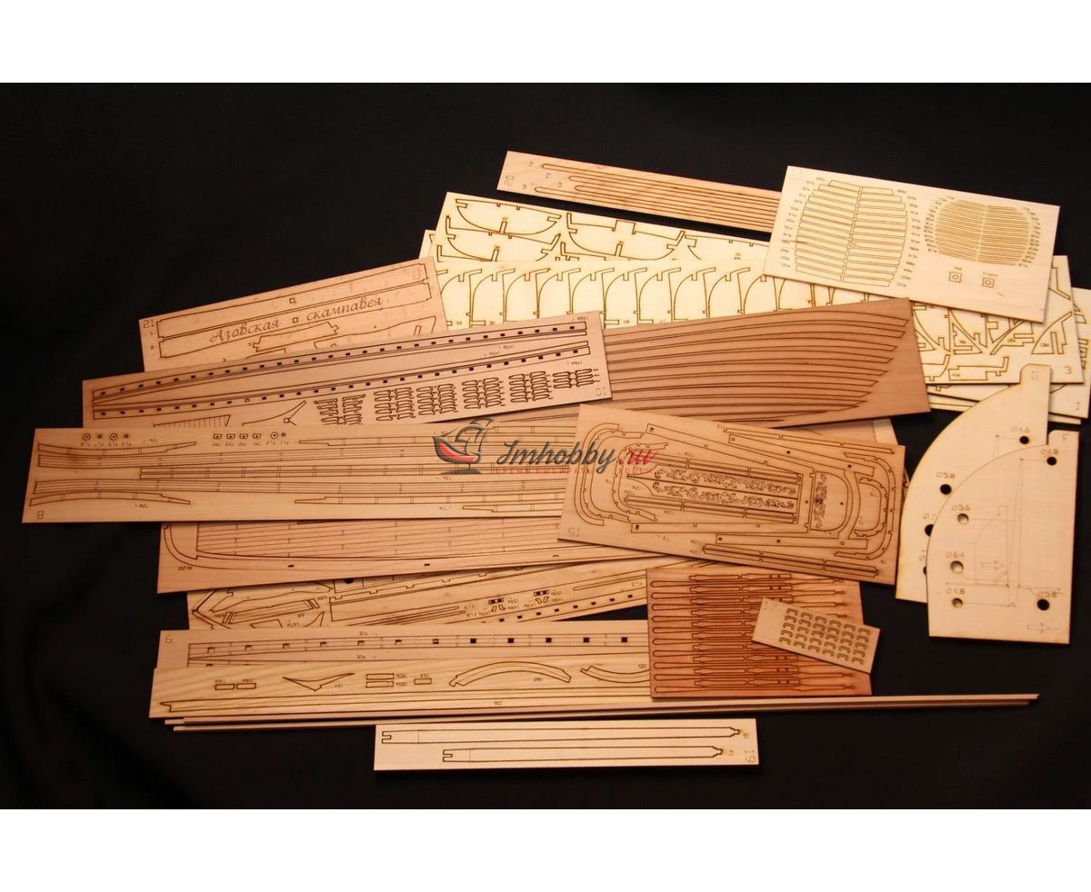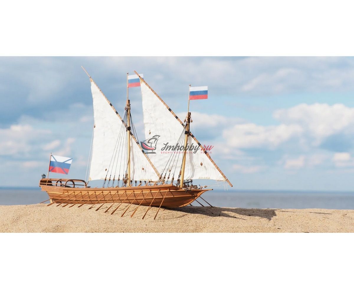 Сборная деревянная модель Азовская скампавея в 48 масштабе от Technell. 19 июля 1696 года русским войскам удалось захватить турецкую крепость Азов. Россия завоевала выход в Азовское море. После этого Боярская Дума постановила Морским судам быть, а принятая осенью 1696 г. Программа предполагала построить корабли на Азовском море. Под это дело по просьбе Петра I венецианский сенат направил в Россию капитана Джакомо (Якова) Моро с 13 мастерами для строительства гребного флота. На Воронежской верфи. Из документов известно, что итальянские мастера строили скампавеи двух типов, оба типа имели две мачты с латинскими парусами и вооружались 2-фунтовой пушкой на носу и двумя 1-2-фунтовыми дробовыми пушками у каюты. Особенностью набора является каркас, с большим количеством шпангоутов. Мы начитали около 40 шпангоутов при небольшой длине корпуса. Обшивка корпуса выполняется из груши, пояса для обшивки уже вырезаны лазером нужной формы. Настил палубы цельными пластинами, на которых выгравирован рисунок палубной раскладки. Всё остальное типично для наборов текущего времени: большое количество вырезанных лазером деревянных деталей, немного фототравления, три литых черненных пушки, отсутствие реек, круглых заготовок и готовых блоков для такелажа. Мачты и реи надо будет сделать круглыми из квадратных заготовок, а блоки склеить послойно из вырезанных плоских деталей. Готовые паруса, немного синтетических нитей двух цветов для такелажа, флаги и вымпелы, подробная пошаговая фотоинструкция. Завершает модель подставка с названием судна. Спецификации: Масштаб - 1:48Длина - 520 ммВысота - 330 ммШирина - 94 мм
