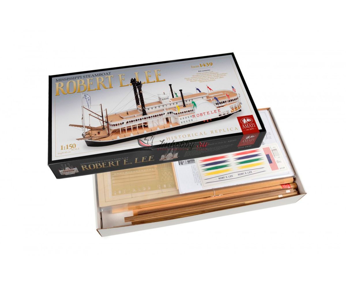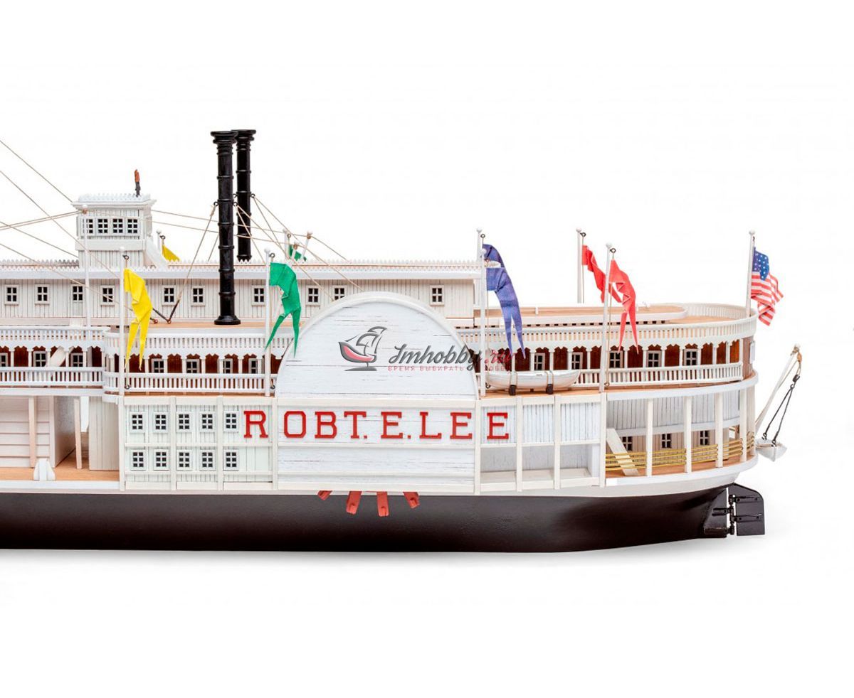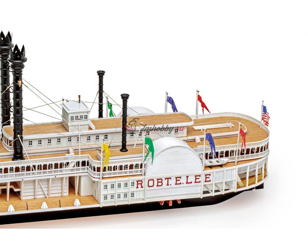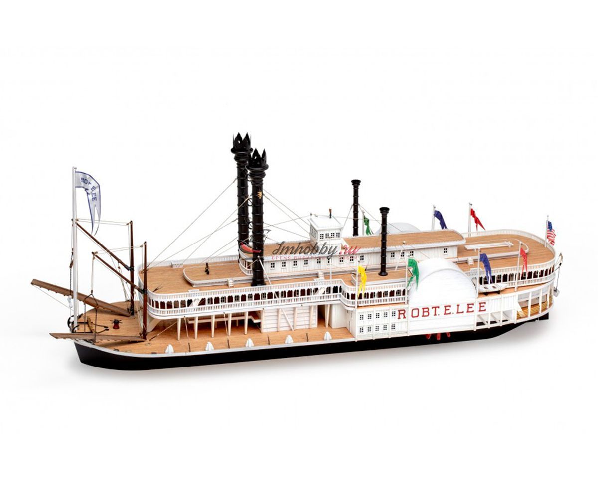 Пароход Robert E. Lee, прозванный впоследствии "Королём Миссисипи", был построен 1866 году, в Нью-Олбани, штат Индиана. Корабль был спроектирован конторой DeWitt Hill и обошёлся в двести тысяч долларов. Пароход решено было назвать в честь одного из самых известных людей в истории Америки генерала Роберта Эдварда Ли, Главнокомандующего армии Конфедеративных Штатов Америки. Наибольшую известность пароход Robert E. Lee приобрёл в 1870 году после победы в гонке с пароходом Natchez, который на то время был рекордсменом скорости.Поскольку сборная модель корабля плоскодонная, корпус у неё цельный, обшивается широкими светлыми рейками. В набор включены фототравленные буквы на борта, литая парадная лестница, множество окон, литые круги гребных колёс, четыре деревянных трубы две больших и две маленьких, а также необходимые флаги. Для облегчения процесса сборки в наборе, помимо шести листов чертежей и подробной инструкции, присутствуют также детальные схемы и список деталей и материалов, с которым не составит труда определить нужную вам заготовку, рейку или же готовую деталь. Инструкция переведена на русский язык.Спецификации:Масштаб 1:150Длина 600 ммВысота 280 мм