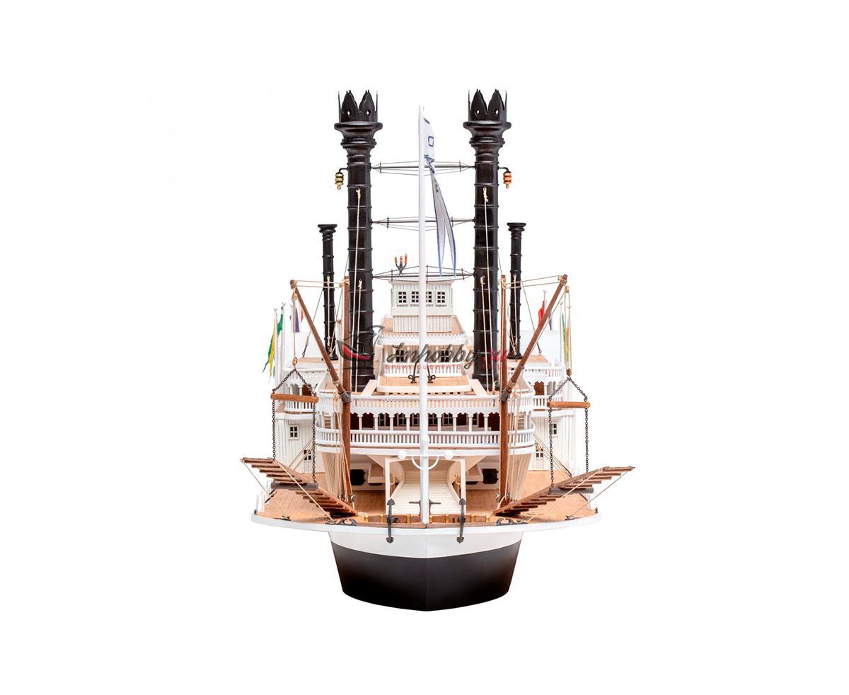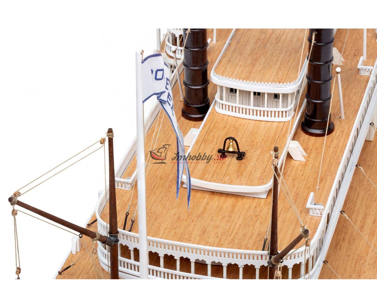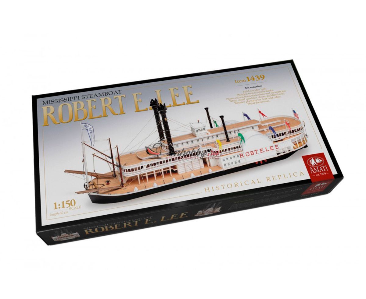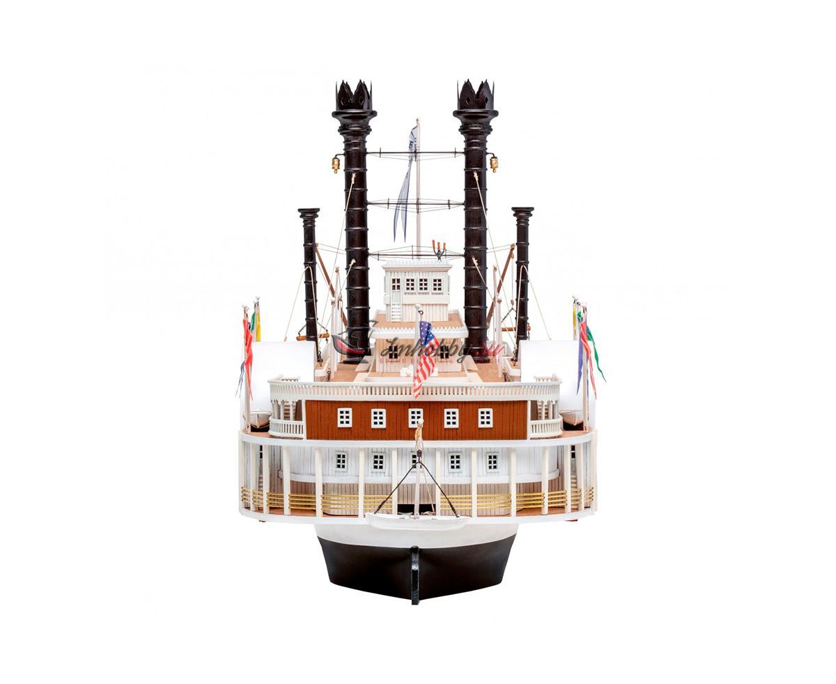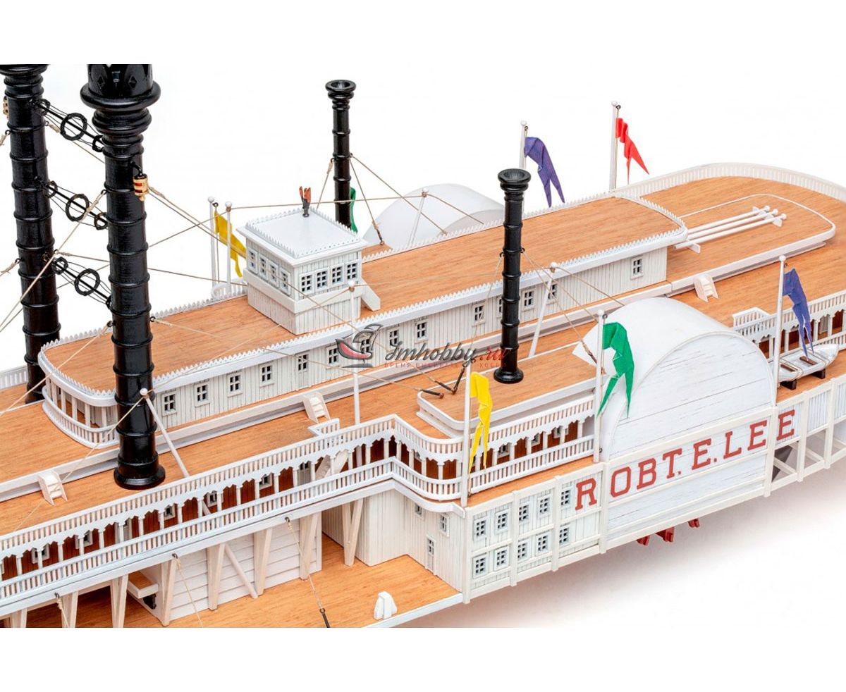 Пароход Robert E. Lee, прозванный впоследствии "Королём Миссисипи", был построен 1866 году, в Нью-Олбани, штат Индиана. Корабль был спроектирован конторой DeWitt Hill и обошёлся в двести тысяч долларов. Пароход решено было назвать в честь одного из самых известных людей в истории Америки генерала Роберта Эдварда Ли, Главнокомандующего армии Конфедеративных Штатов Америки. Наибольшую известность пароход Robert E. Lee приобрёл в 1870 году после победы в гонке с пароходом Natchez, который на то время был рекордсменом скорости.Поскольку сборная модель корабля плоскодонная, корпус у неё цельный, обшивается широкими светлыми рейками. В набор включены фототравленные буквы на борта, литая парадная лестница, множество окон, литые круги гребных колёс, четыре деревянных трубы две больших и две маленьких, а также необходимые флаги. Для облегчения процесса сборки в наборе, помимо шести листов чертежей и подробной инструкции, присутствуют также детальные схемы и список деталей и материалов, с которым не составит труда определить нужную вам заготовку, рейку или же готовую деталь. Инструкция переведена на русский язык.Спецификации:Масштаб 1:150Длина 600 ммВысота 280 мм