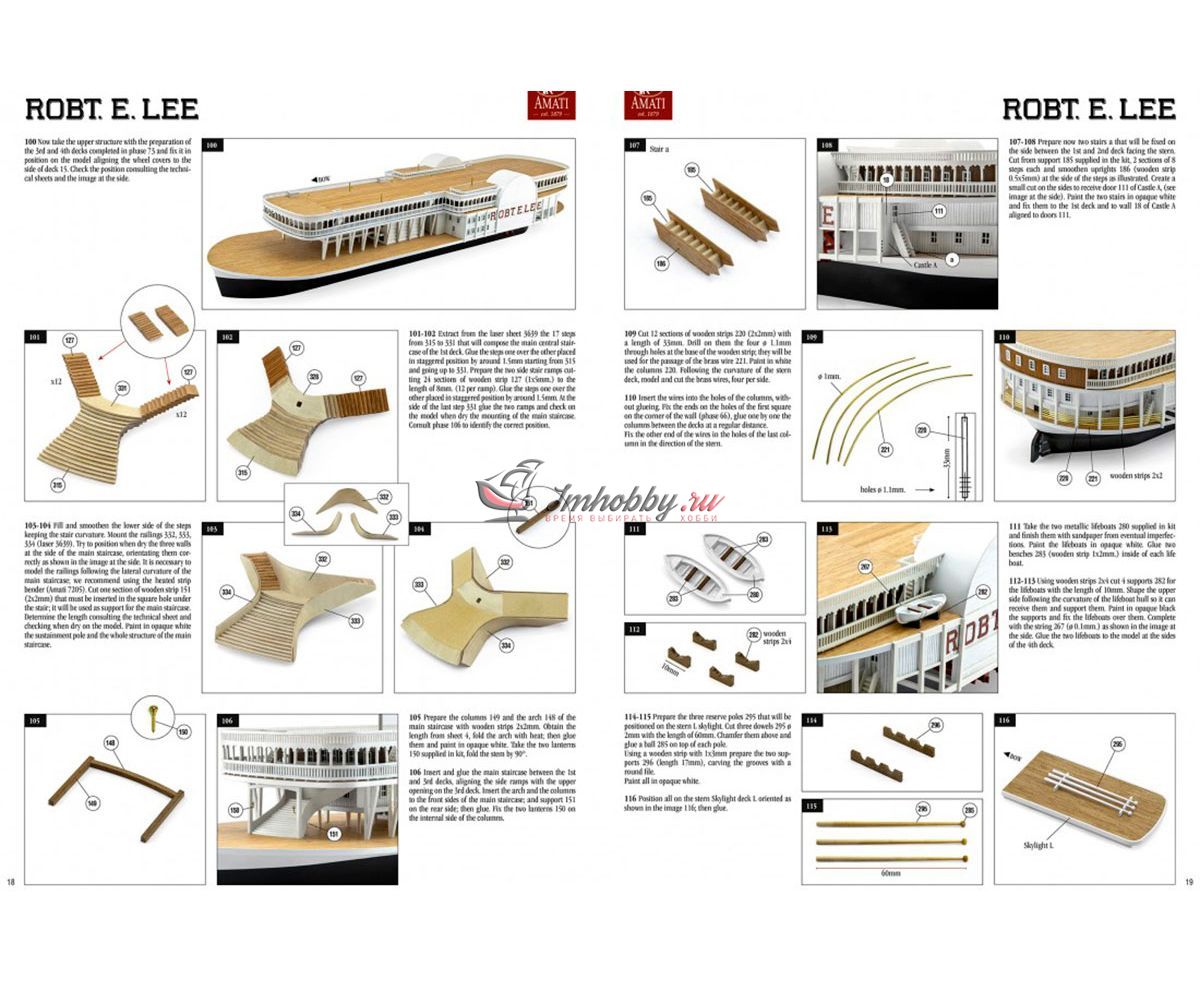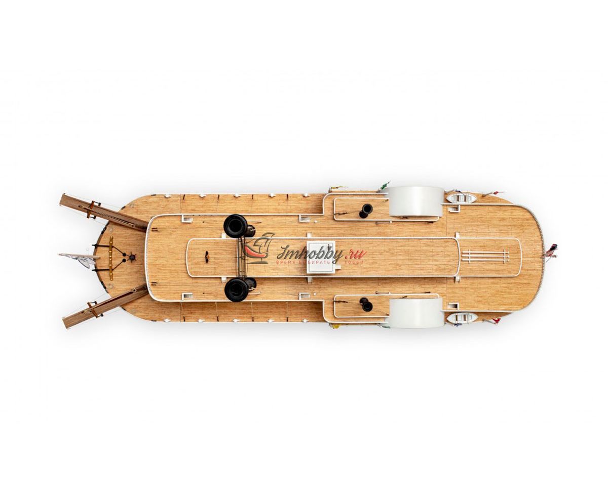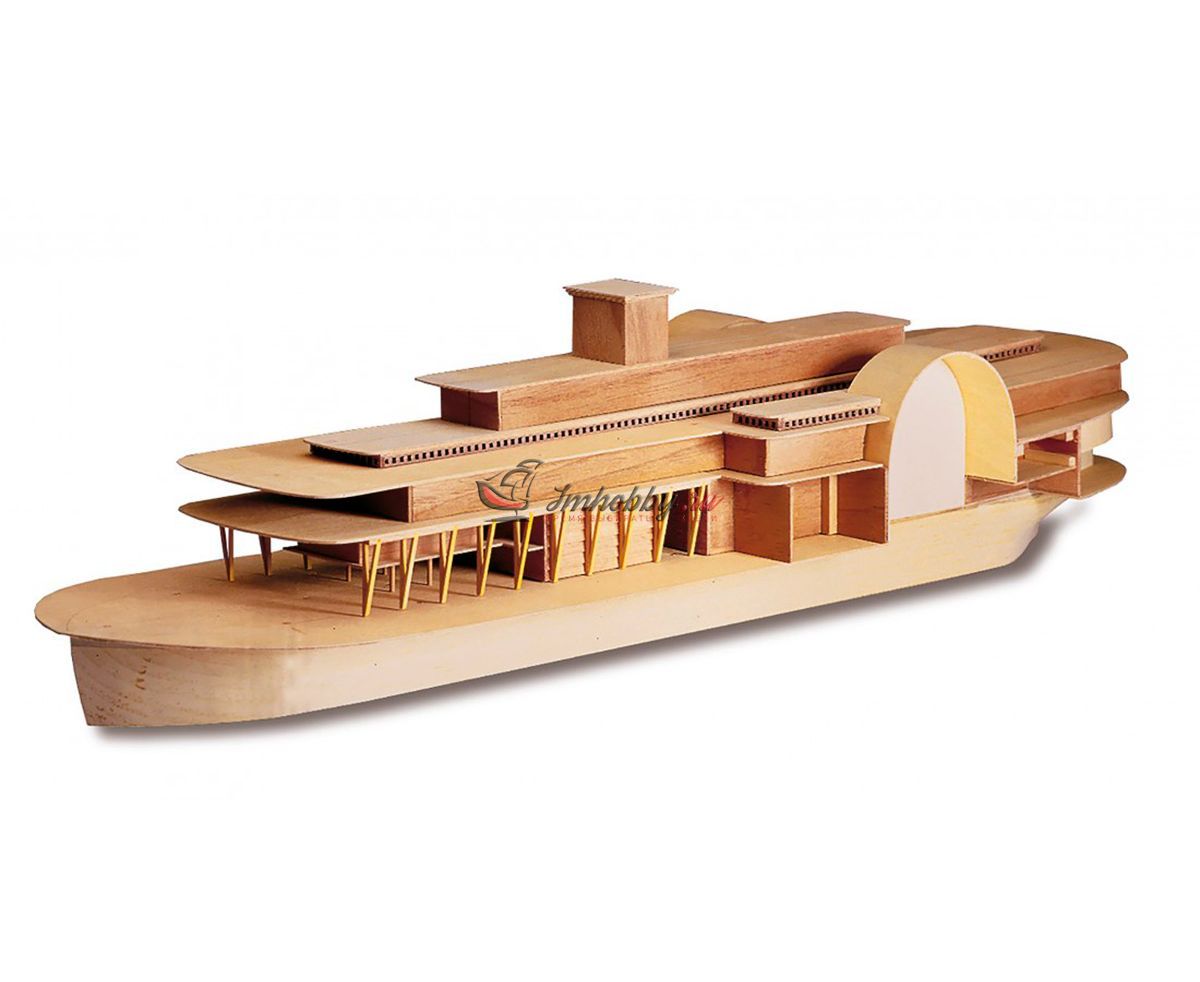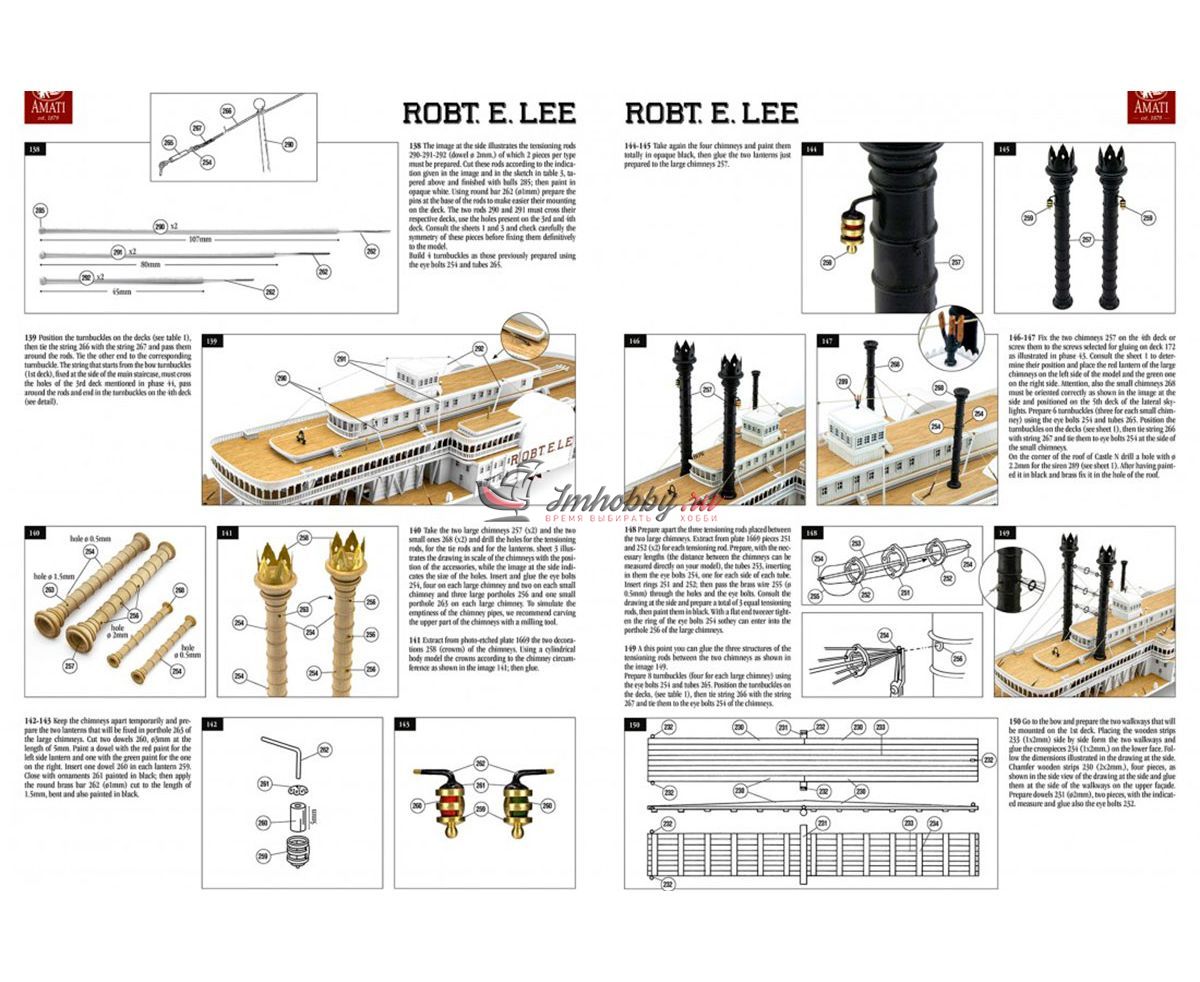 Пароход Robert E. Lee, прозванный впоследствии "Королём Миссисипи", был построен 1866 году, в Нью-Олбани, штат Индиана. Корабль был спроектирован конторой DeWitt Hill и обошёлся в двести тысяч долларов. Пароход решено было назвать в честь одного из самых известных людей в истории Америки генерала Роберта Эдварда Ли, Главнокомандующего армии Конфедеративных Штатов Америки. Наибольшую известность пароход Robert E. Lee приобрёл в 1870 году после победы в гонке с пароходом Natchez, который на то время был рекордсменом скорости.Поскольку сборная модель корабля плоскодонная, корпус у неё цельный, обшивается широкими светлыми рейками. В набор включены фототравленные буквы на борта, литая парадная лестница, множество окон, литые круги гребных колёс, четыре деревянных трубы две больших и две маленьких, а также необходимые флаги. Для облегчения процесса сборки в наборе, помимо шести листов чертежей и подробной инструкции, присутствуют также детальные схемы и список деталей и материалов, с которым не составит труда определить нужную вам заготовку, рейку или же готовую деталь. Инструкция переведена на русский язык.Спецификации:Масштаб 1:150Длина 600 ммВысота 280 мм