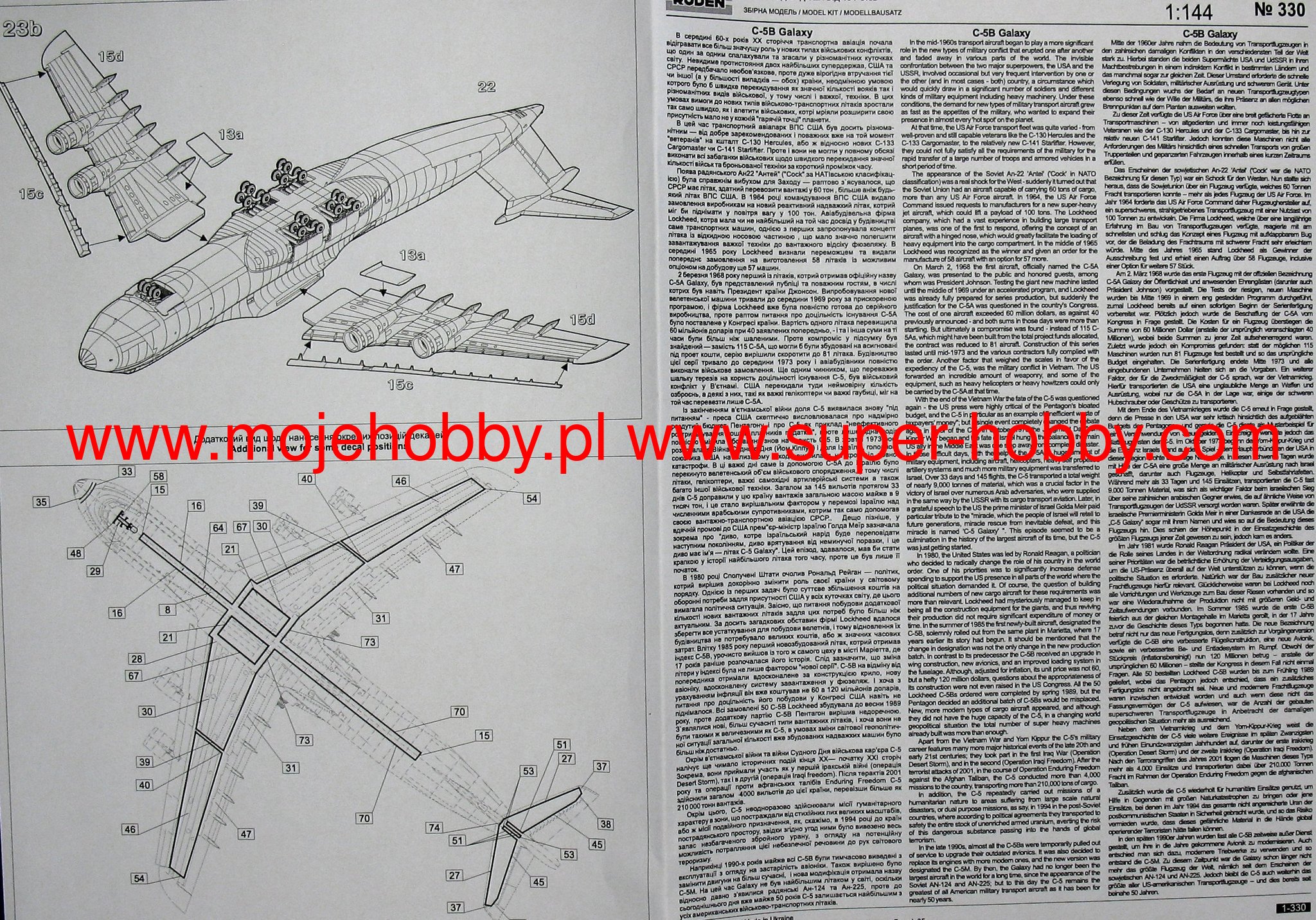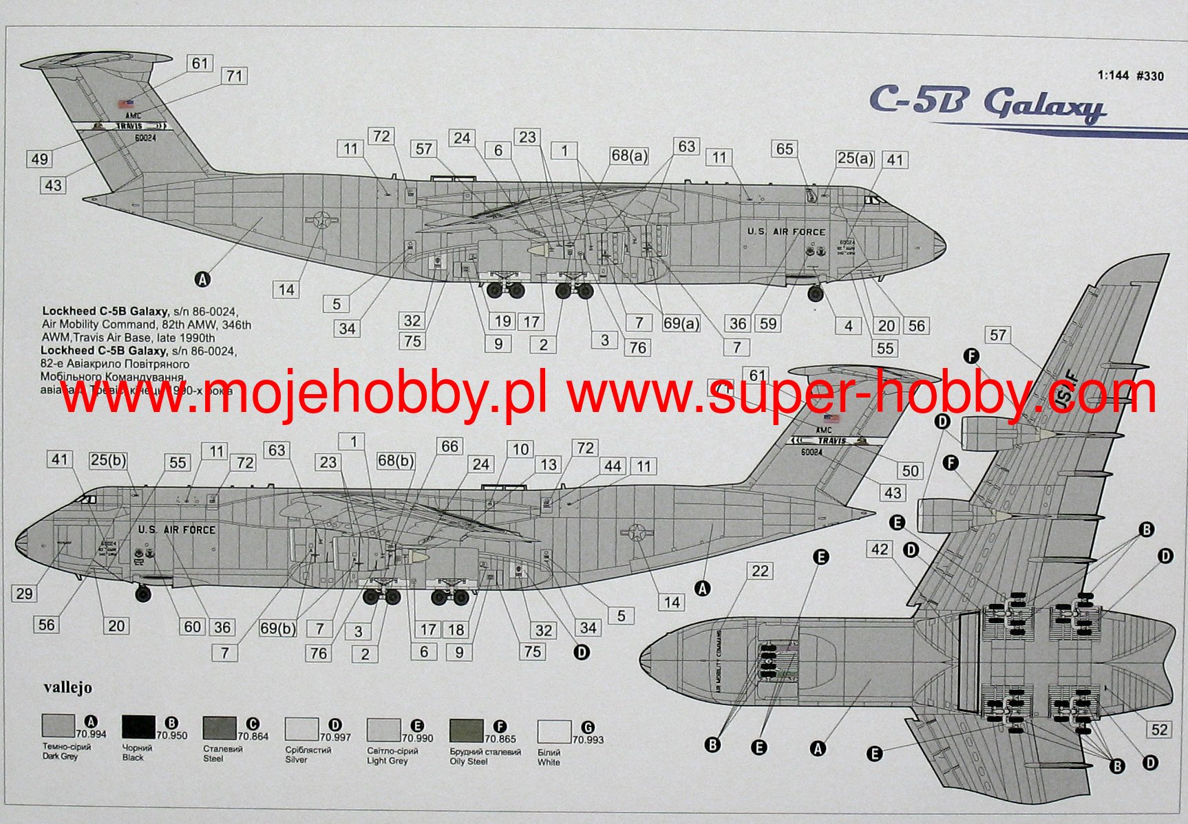 The Lockheed C-5B Galaxy plane is a four-engine heavy transport plane in a cantilever high wing system. In March 1968, the first C-5A was completed, and its flight took place on June 30 of that year. The first five aircraft were delivered in 1969, normal production continued until 1973, when the Air Force took delivery of a total of 79 C-5As. In 1999, the modernization of the C-5 - C-5M fleet began. It consists of two programs: Avionics Modernization Program (AMP) - analogue to digital avionics exchange program, and Reliability Enhancement and Re-engining Program (RERP) - program for increasing the durability of the structure and replacing engines with engines used in passenger aircraft (General Electric CF6 -80C2L1F). 112 C-5A and C-5B aircraft were upgraded to the C-5M standard. Transport possibilities of the C-5A / B: 2 M1A1 / 2 Abrams tanks; 4 M2 / 3 Bradley infantry fighting vehicles; 1 M1A1 / 2 tank and 2 M2 / 3 infantry fighting vehicles; 5 M551 Sheridan light tanks; 4 M551 tanks and 1 HMMWV off-road vehicle; 16 HMMWV cars; 12 5-ton trucks; 10 M113 or LAV-25 transporters; 4 self-propelled howitzers M109; 4 UH-60 helicopters; 2 AH-64 helicopters and 3 OH-58 helicopters; 1 CH-47 helicopter. Technical data: Maximum speed: 932 km / h, speed of climb: 9.14 m / s, maximum ceiling 10 600 m, maximum range (without air refueling): 4 440 km, length: 75.31 m, wingspan: 67.89 m , height: 19.84 m.