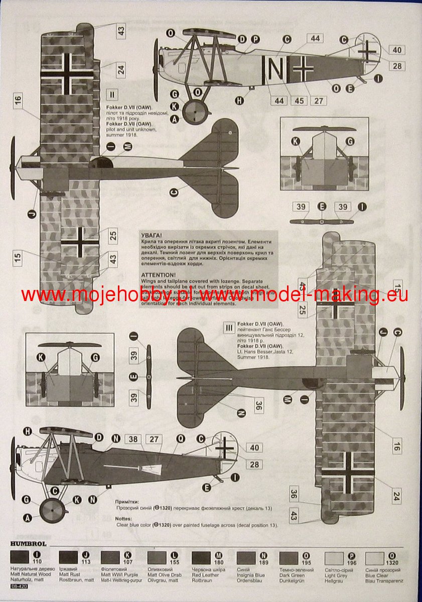 The Fokker D.VII is a German biplane fighter with a mixed structure (plywood, canvas, aluminum) from the end of the First World War. The flight of the prototype took place in January 1918, and in May of the same year, the plane entered service in the air. The Fokker D VII quickly demonstrated its superiority over the Allied aircraft. It had higher acceleration and a higher ceiling, which, combined with very good control devices, made the German pilots able to defeat 565 Allied machines in August 1918. Designed by Reinhold Platz, D VII was selected from among many other designs during the competition between January-February 1918. Baron Manfred von Richthofen (known as the "Red Baron") himself flew a prototype marked with the code V11. He later stated that the plane was easy to navigate, had a good climb rate, and was suited to "dive" flights in which the Fokker was found to be "rock hard". Other pilots also emphasized good visibility from the cockpit. The plane was of a mixed construction. The rectangular hull was made of welded steel pipes with a cloth cover. Only the nose of the fuselage housing the engine had removable side covers made of aluminum sheet. Double-girder panels, connected with each other by thin N-shaped stands, free-bearing with a thick profile, covered with plywood up to the first girder, the rest with canvas. The plane used Mercedes D.IIIa (180-200HP) or BMW IIIa 185HP engines as the drive. The BMW engine was a much better power unit, but as a result of limited production, the Mercedes engine was used on a much larger scale. It is worth noting that the Fokker D.VII flew min. Herman Goring, who achieved many air victories on it. The quality of the machine can be proved by the fact that it was produced until 1926. Technical data (for the version with the BMW-Fokker D.VIIF engine): length: 6.95 m, wingspan: 8.9 m, height: 2.75 m, maximum speed: 200 km / h, climb speed: 9, 52 m / s, maximum ceiling 6000 m, armament: fixed - 2 LMG 08/15 machine guns, cal. 7.92 mm.