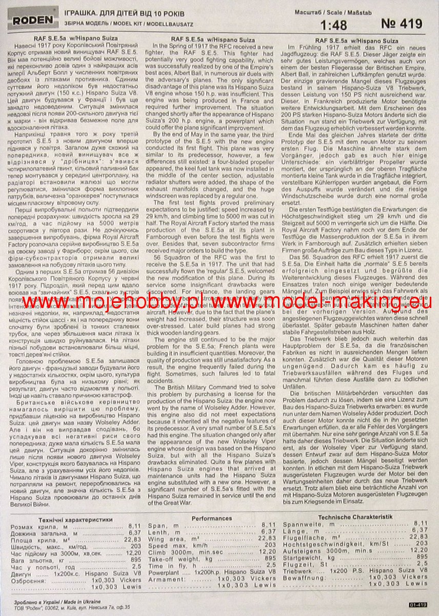 СБОРНАЯ МОДЕЛЬ RAF S.E.5A W/HISPANO SUIZA roden 1/48