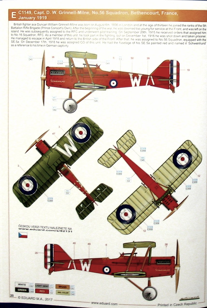 The Royal Air Factory SE.5 is a British mixed-wing fighter biplane with a classic tail from the First World War. It was created as a British response to the appearance of great Fokker and Albatros fighters on the Western Front in 1916. The flight of the prototype took place in November 1916, and the machine was delivered to the linear units in March 1917. The drive was a Hispano-Suiza engine with a capacity of 200 HP, which powered the first 60 serial aircraft, in the remaining examples the Waseley W4A Viper engine of the same power was used. The SE.5 was a successful fighter, with great performance, good weapons, easy handling and good resistance to enemy fire. Many Allied fighter aces flew on it, including: Billy Bishop, James McCudden and Albert Ball. Technical data: length: 6.38 m, wingspan: 8.11 m, height: 2.89 m, maximum speed: 222 km / h, practical ceiling: 5180 m, maximum range: 483 km, armament: fixed - 2 machine guns cal.7, 7mm. 3_edu82131_instruction_sheet.pdf