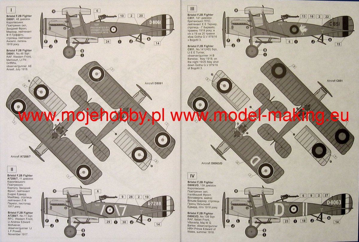 In 1916. the British Royal Flying Corps ordered a two-seater fighter from several aviation companies, which could defend itself against attacks by enemy aircraft. An observer or a shooter in the second cabin, operating a movable machine gun mounted on a turntable, was to contribute to this. The construction of such an aircraft was undertaken by the Bristol company, and at the beginning of 1916. Eng. Frank Bornwell, the company's constructor, designed the plane in a biplane layout, with the fuselage suspended between the wings and with a very close distance between the pilot's and observer's or gunner's open cabins so that they could easily communicate. The prototype of the plane powered by the Falcon in-line engine, designated the Bristol F.2A, was flew on September 9, 1916. During the flight tests, the prototype confirmed the good handling properties and the assumed performance. At that time, 50 of these aircraft were ordered, with which two Royal Flying Corps squadrons were equipped. After introducing a few design changes, the series production of the aircraft, designated the Bristol F.2B Fighter, began. In addition to British aviation orders, the plant also received orders from other countries. Overall, from 1916. by the end of World War I, 3101 Bristol F.2B Fighter aircraft were produced, and after its completion, a further 378 aircraft for British and 49 for foreign aviation. They were also produced under license in the USA of 50 pieces and in Belgium - 40 pieces. For the first time, 6 Bristol F.2B planes from 40 Squadron fought in the air on April 5, 1917. over Arras in France with 5 fighter planes from Richthofen's squadron. The German pilots then shot down 4 English planes without suffering any losses. Only the change of the tactics of using these planes from defensive to offensive showed their advantages and the pilots on these planes achieved a number of victories and so 20 RFC squadron equipped with Bristol F.2B Fighter planes shot down a total of 613 enemy planes. Individually, the most victories on this type of aircraft were achieved by the Canadian crew: Maj. Pil. A. Mac Keever and the gunner LF Powell, the first of them shot down 30 and the second 6 German planes within six months. The advantages of this aircraft, which were confirmed during the fights in World War I, meant that it was used in the British RAF aviation until 1932. Until the mid-thirties, it was also used in aviation, among others in Belgium, China and Spain. Ireland and Mexico. Technical data: Maximum speed: 192 km / h, speed of climb: 5.1 m / s, maximum altitude: 6100 m, maximum range: 467 km, armament: fixed - 3 machine guns, 7.7 mm caliber.