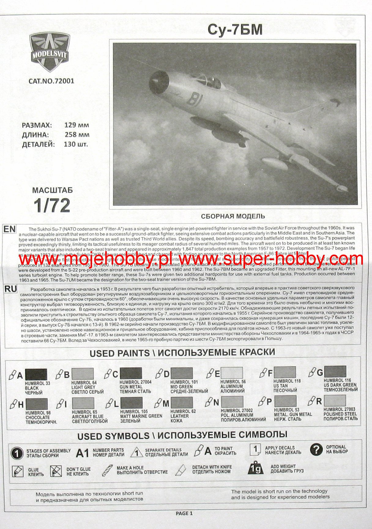 The Sukhoi Su-7 is a Soviet fighter-bomber with oblique wings, full metal structure with a classic tail. The drive was provided by a single Lulka AL-7F1 engine. The flight of the prototype took place on September 8, 1955. It entered the line in 1958. The first production version was the machine designated as Su-7, acting as a fighter plane. However, a very interesting tactical variant of the Su-7B quickly appeared. At the end of the years. 50, the Soviet command promoted the concept of "atomization" and "rocketization" of the battlefield. The main role of carrying atomic charges on the tactical battlefield was to be played by ground-to-ground missiles and barrel artillery, but for the elimination of particularly mobile cells (columns of troops) or requiring a precise strike (nuclear weapons of the enemy, secured command and communication stations), it was intended to be used as carrier of a high-speed supersonic plane. Due to the high speed, large payload, "strong" engine and the appropriate range, and equally importantly, the need to quickly put the machine into service (before the Su-7B, provisionally modified Mig-15 / -17 was used for this role), the choice fell on the Sukhoi design. In the mid-1960s, the plane was recommended for serial production of the Suchoja Su-7B, the first units left the production line in the second half of this year. Later, new versions were created, such as the Su-7BM, with additional rocket launch engines, the Su-7UB, i.e. a training version with a two-person cabin, or the Su-7BK or Su-7BKL versions. Technical data: length: 16.8m, wingspan: 8.77m, height: 4.8m, maximum speed: 1.6Ma, climb speed: 152m / s, practical ceiling: 15500m, maximum range: 1450km, armament: permanent- 2 NR-30 30mm cannons, suspended - up to 4000 kg of cargo on 4-6 under-wing pylons.