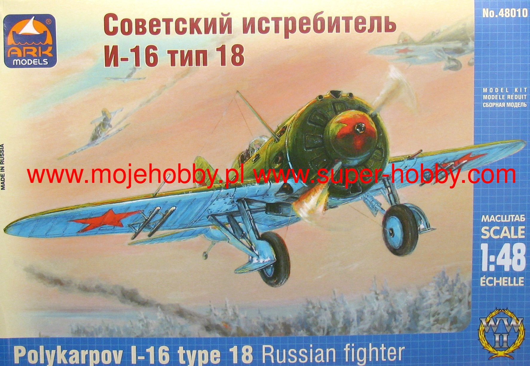 Дополнительная информация В начале 1939 года был решен вопрос с заменой двигателя М-25 на более мощный - М-62. Восьмисоттрицатисильный М-62 определил и появление новой модификации И-16 тип 18. Тип 18 был создан на базе И-16 тип 10. Переделки коснулись усиления моторами, установки протектированного бензобака, значительного изменения маслосистемы. Добавлен дополнительный маслобак 12 л. Маслорадиатор увеличен до 8 дюймов, установка его несколько ниже, отчего капот в нижней части слегка провис. Патрубок (заборник) маслорадиатора увеличен. Вверху появился патрубок скоростного напора карбюратора. Выколотка на кольце капота под тендер стягивающей ленты перенесена снизу набок, напротив выколоток под лыжи. Первая партия машин типа 18 была оборудована винтом фиксированного шага (ВФШ) - в этом случае кок винта ставился с типа 10. На машины, оборудованные винтом изменяемого шага (ВИШ), кок ставился новый, специально сделанный для этого винта. На последних машинах винт ставился АВ-1, кок при этом был уже новый с типа 24. Однако, прежде чем тип 18 стал выпускаться серийно, замена двигателя произошла в боевых условиях. Во второй половине лета 1939 года началось применение И-16, оснащенных двигателем М-62 - впоследствии такие машины стали обозначаться как тип 18. М-62, обладая большой мощностью и высотностью, мог устанавливаться вместо двигателя М-25 практически без переделок. Испытания первой машины с новым мотором показали, что летные данные значительно возросли.. Следующим этапом для завода стал И-16 с еще более мощным двигателем М-63. Этот самолет в четырехпулеметном варианте стал называться тип 24. Хотя установка М-62 и М-63 тормозилась отсутствием достаточного количества воздушных винтов переменного шага и некоторых агрегатов - тип 18 и тип 24 постройки завода №21 успели принять участие в заключительной фазе войны в Монголии. В комплект входит: пластиковые литники, декаль и инструкция.