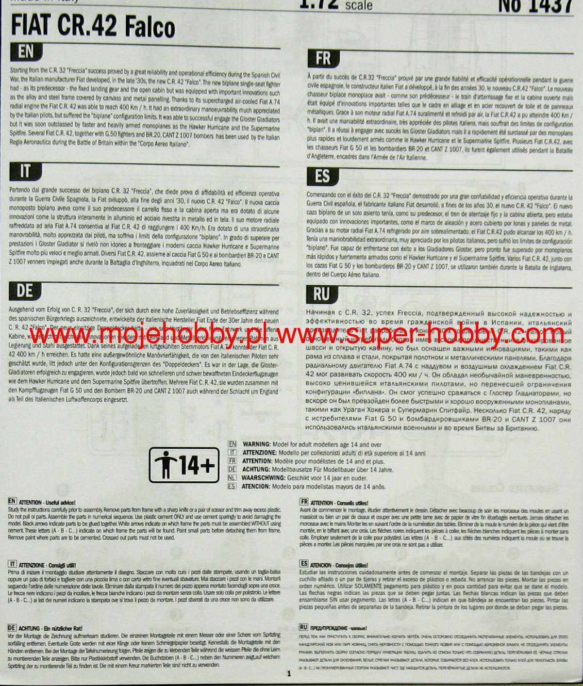 Starting from the C.R. 32 "Freccia" success proved by a great reliability and operational efficiency during the Spanish Civil War, the Italian manufacturer Fiat developed, in the late ‘30s, the new C.R. 42 "Falco". The new biplane single-seat fighter had - as its predecessor - the fixed landing gear and the open cabin but was equipped with important innovations such as the alloy and steel frame covered by canvass and metal panelling. Thanks to Its supercharged air-cooled Fiat A.74 radial engine the Fiat C.R. 42 was able to reach 400 Km / h. It had an extraordinary manoeuvrability, much appreciated by the Italian pilots, but suffered the "biplane" configuration limits. It was able to successful engage the Gloster Gladiators but it was soon outclassed by faster and heavily armed monoplanes as the Hawker Hurricane and the Supermarine Spitfire. Several Fiat C.R. 42, together with G.50 fighters and BR.20, CANT Z 1007 bombers has been used by the Italian Regia Aeronautica during the Battle of Britain within the “Corpo Aereo Italiano”.