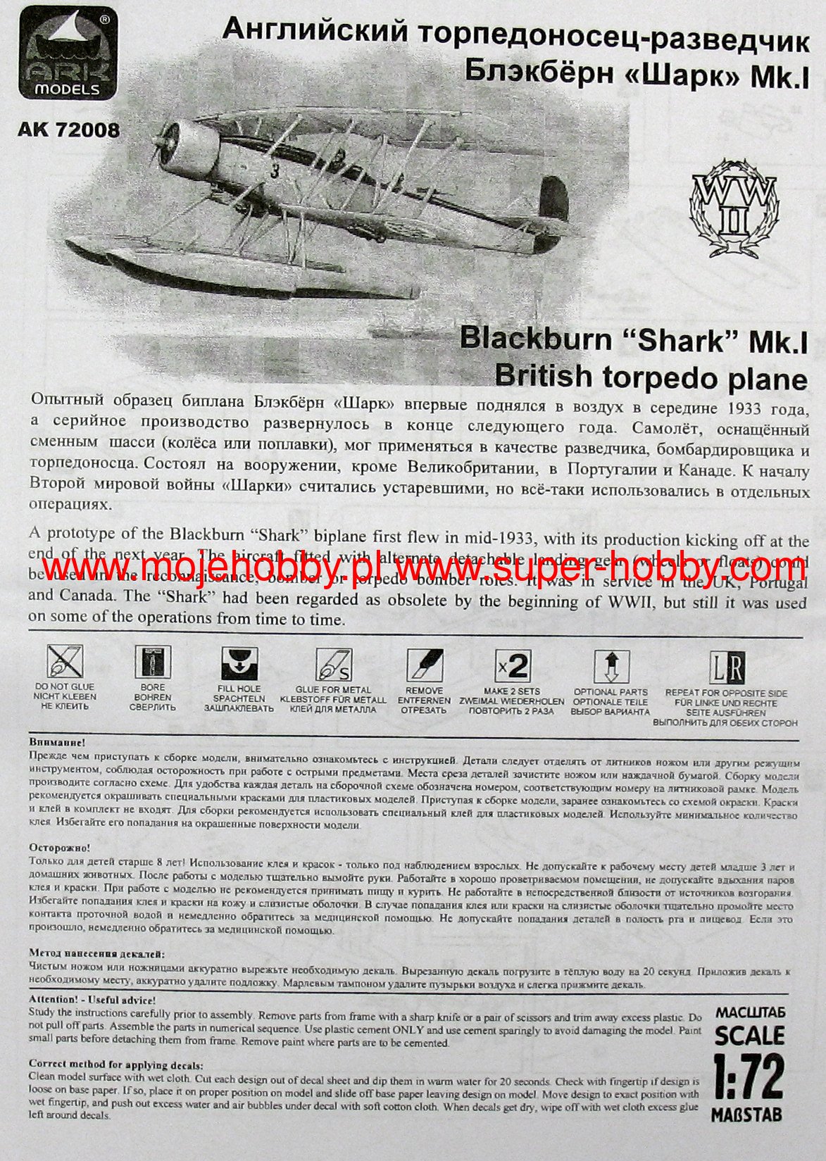Дополнительная информация Опытный образец биплана Блэкбёрн Шарк впервые поднялся в воздух в середине 1933 г., а серийное производство развернулось в конце следующего года. Самолёт, оснащённый сменным шасси (колеса или поплавки) мог применяться в качестве разведчика, бомбардировщика и торпедоносца. Состоял на вооружении, кроме Великобритании, в Португалии и Канаде. К началу Второй мировой войны Шарки считались устаревшими, но всё-таки использовались в отдельных операциях. В комплект входит: пластиковые литники, декаль и инструкция.