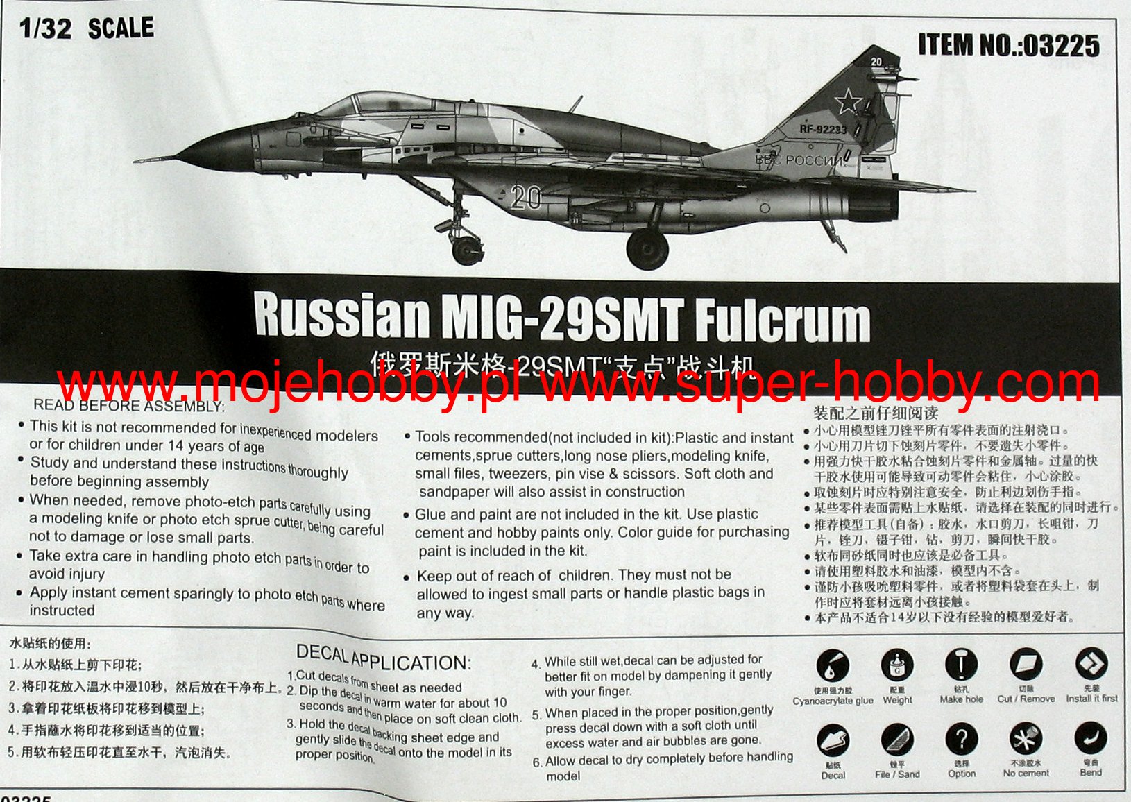 RUSSIAN MIG-29SMT FULCRUM (МИГ-29СМТ ИЗДЕЛИЕ 9-17 СОВЕТСКИЙ МНОГОЦЕЛЕВОЙ ИСТРЕБИТЕЛЬ) (1/32) продается в 1 магазинах. Выберите подходящий Вам интернет-магазин и перейдите по ссылке «В магазин».