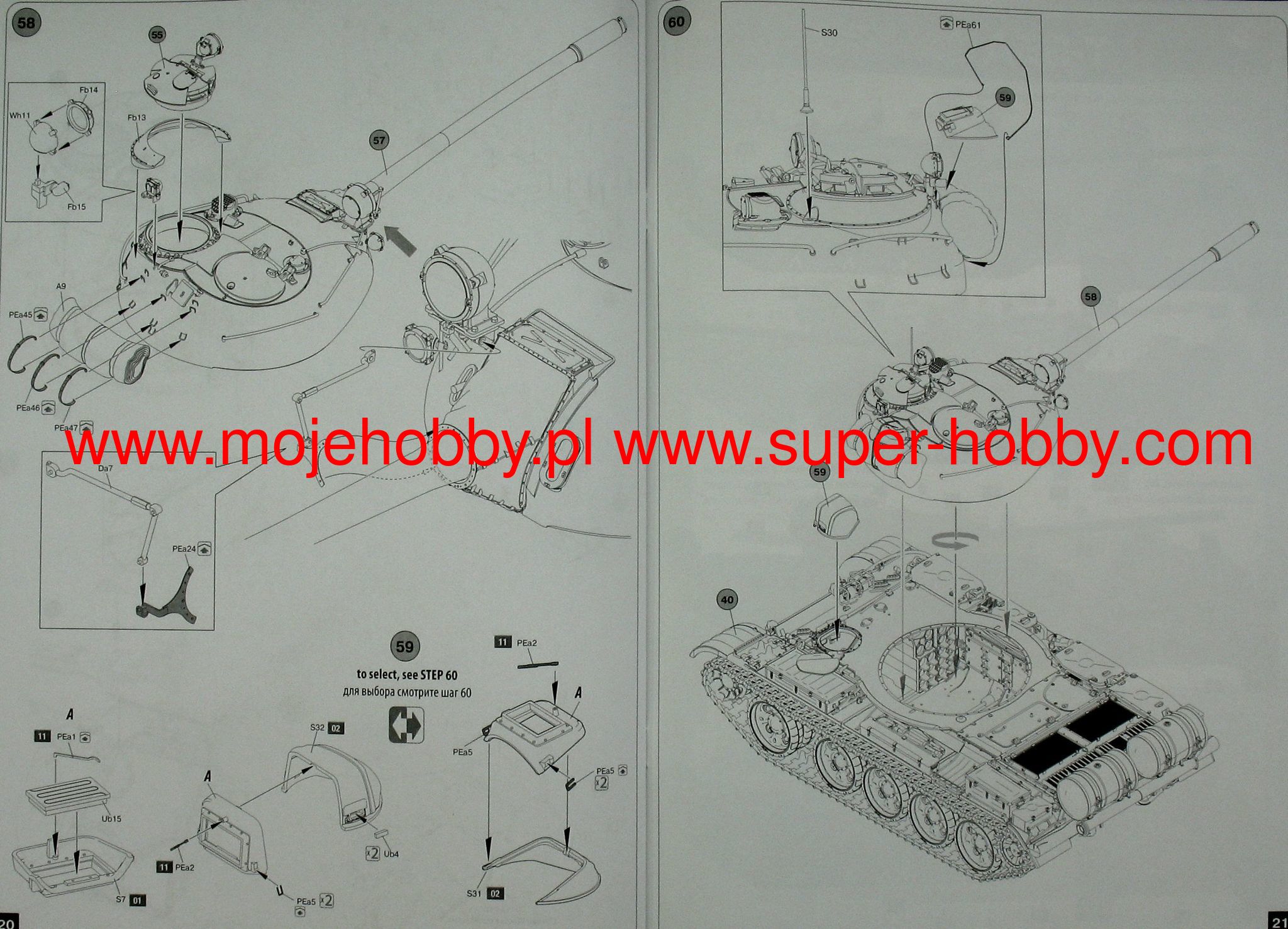 Kit contains model of Soviet medium tank T-55A. HIGHLY DETAILED MODEL WORKABLE TORSION BARS ALL HATCHES CAN BE POSED OPEN OR CLOSED INDIVIDUAL TRACK LINKS TOTAL DETAILS 898 718 PLASTIC PARTS 154 PHOTOETCHED PARTS 26 CLEAR PLASTIC PARTS 9 VARIANTS OF PAINTING AND MARKING BUILD UP OPTIONS: The kit can be assembled with or without fitting for mine roller system. Fitting options of deep wading equipment. 2 types of fuel tanks. 2 types of toolboxes. 2 options of anti-rain cover for driver. The kit can be build up with or without gun mantlet cover. Build up options: 2 operating modes (day/night).