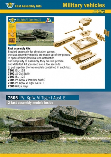 CONTAINS TWO FAST ASSEMBLY MODELS - NEW DECALS SHEETThe Tiger was certainly the most famous armored vehicle of World War II. Its fire power and protective armor made it the dominating factor on all battle fields during the years 1943-44. It did, however, present considerable problems, due to its complex mechani?cal construction. The Tiger crews were continuosly engaged in maintenance work, which was aggravated through extreme conditions in the African desert and the Russian Plains. CONTAINS TWO FAST ASSEMBLY MODELS.