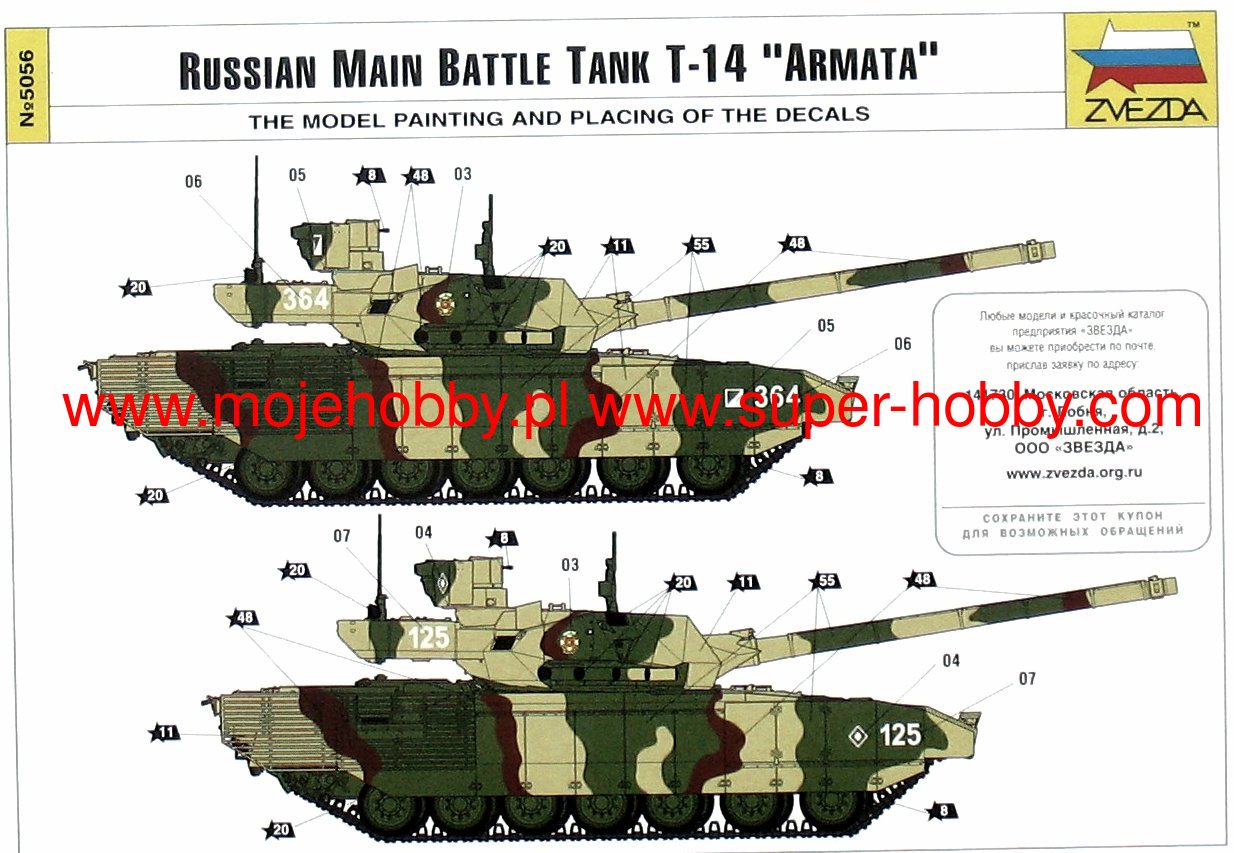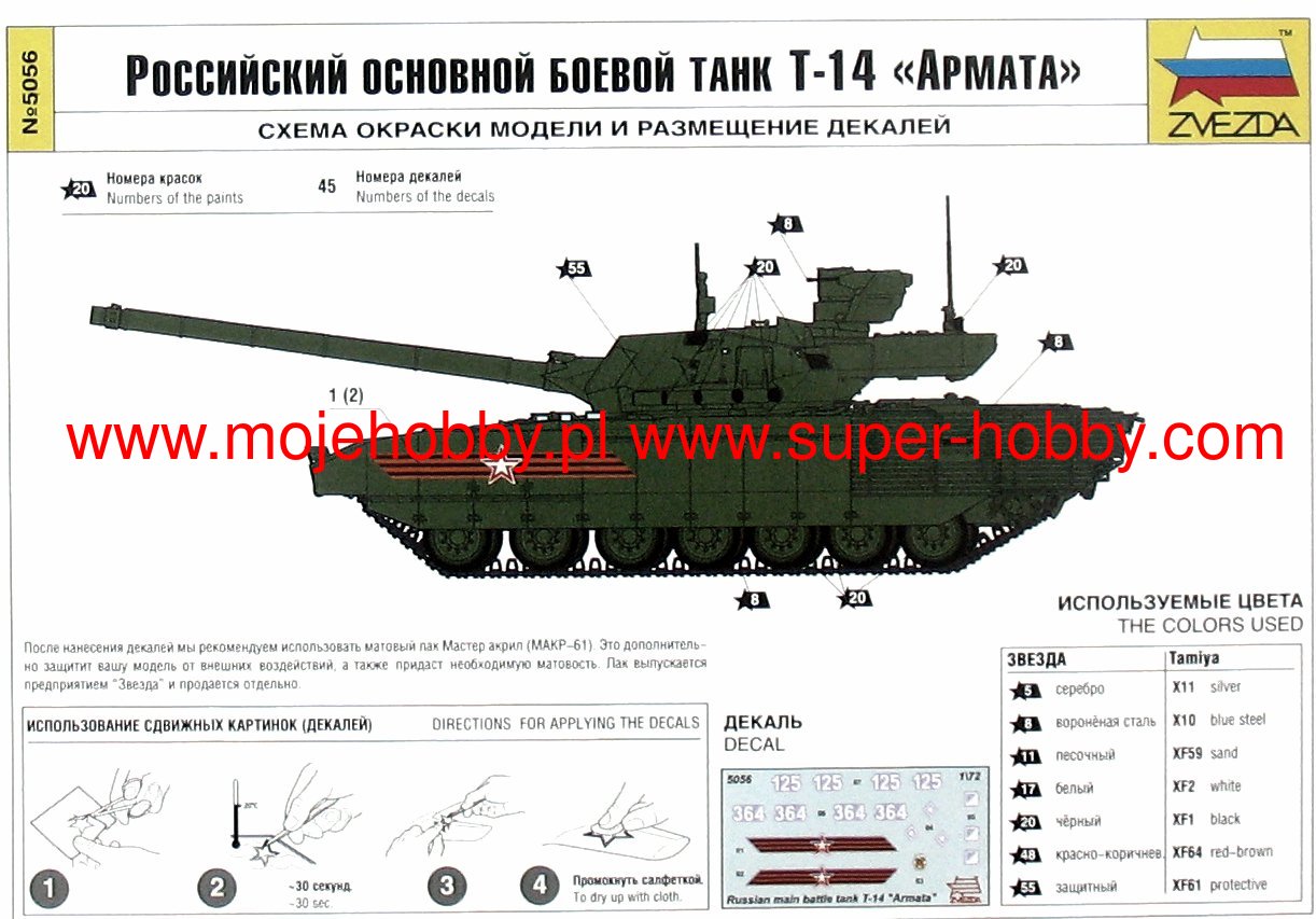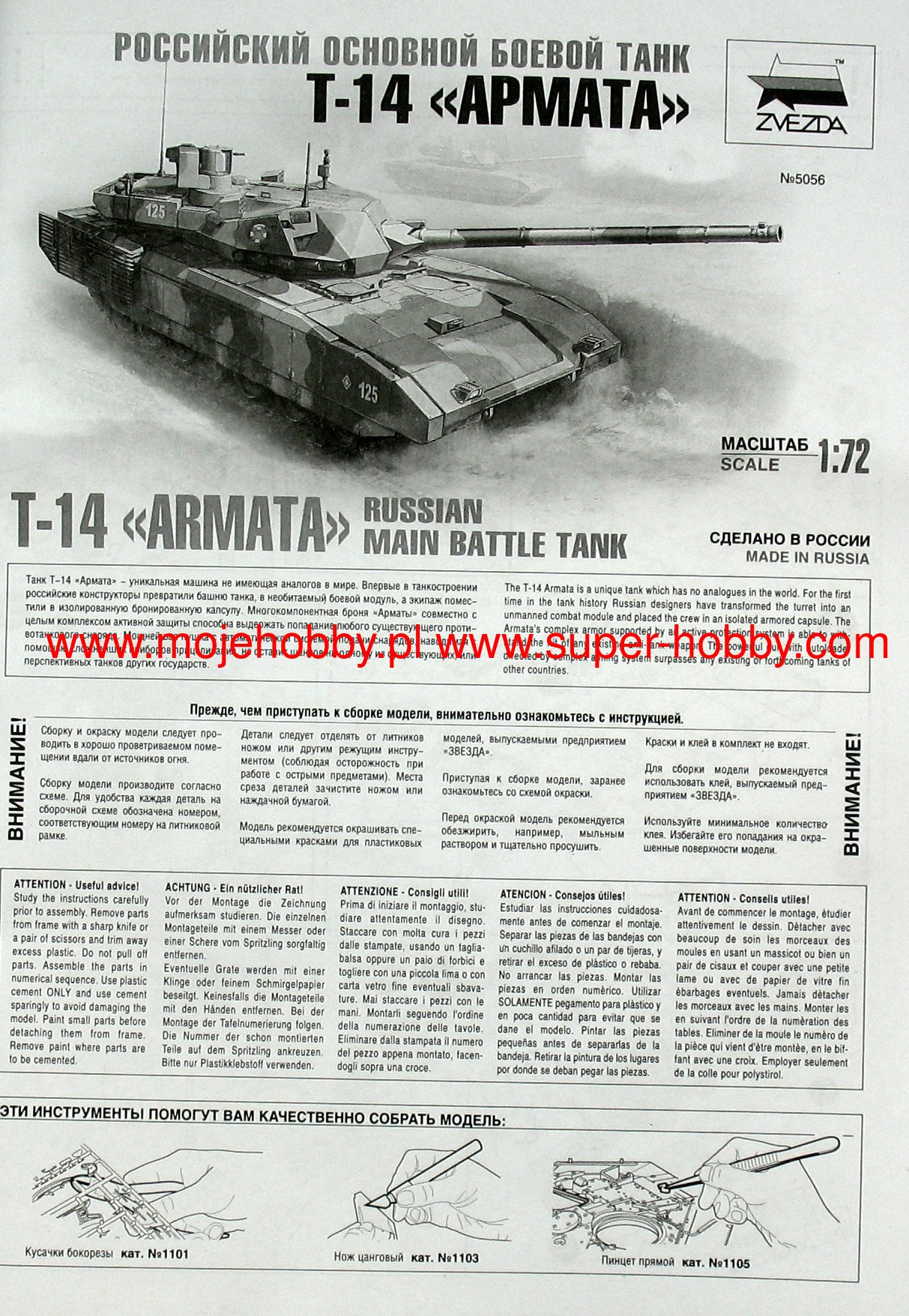 Сборная модель - Российский основной боевой танк Т-14 "Армата" Историческая справка: Армата уникальная машина не имеющая аналогов в мире. Впервые в танкостроении российские конструкторы превратили башню танка, в необитаемый боевой модуль, а экипаж поместили в изолированную бронированную капсулу. Многокомпонентная броня Арматы совместно с целым комплексом активной защиты способна выдержать попадание любого существующего противотанкового снаряда. Мощнейшая пушка с автоматической системой подачи снарядов, наводимая с помощью сложнейших приборов прицеливания, не оставит шансов ни одному из существующих, или перспективных танков других государств. Набор деталей из пластмассы для сборки одной модели неокрашенного танка. Модель собирается при помощи специального клея, выпускаемого предприятием Звезда. Состав набора: отливки инструкция по сборке цветной вкладыш декаль