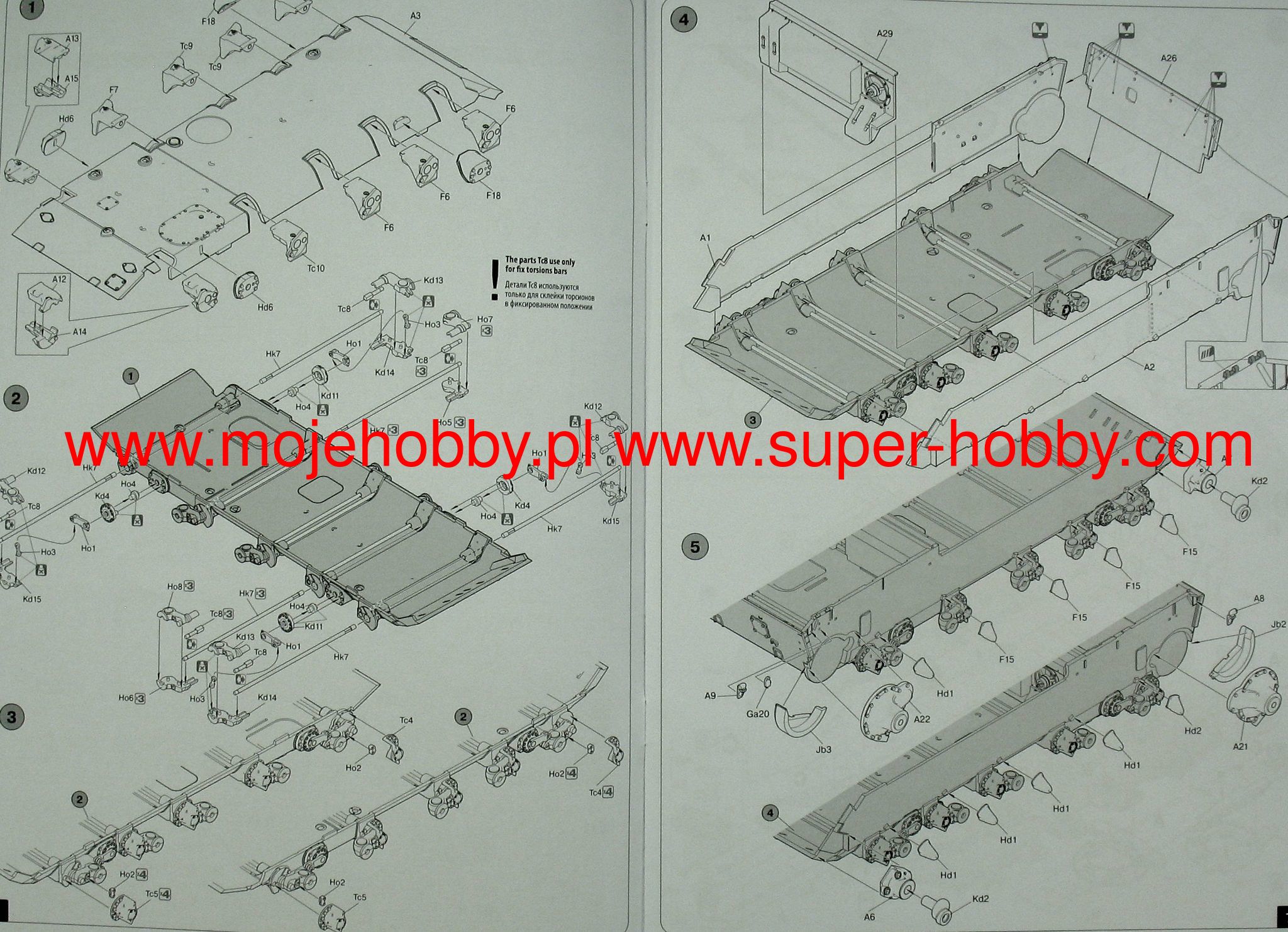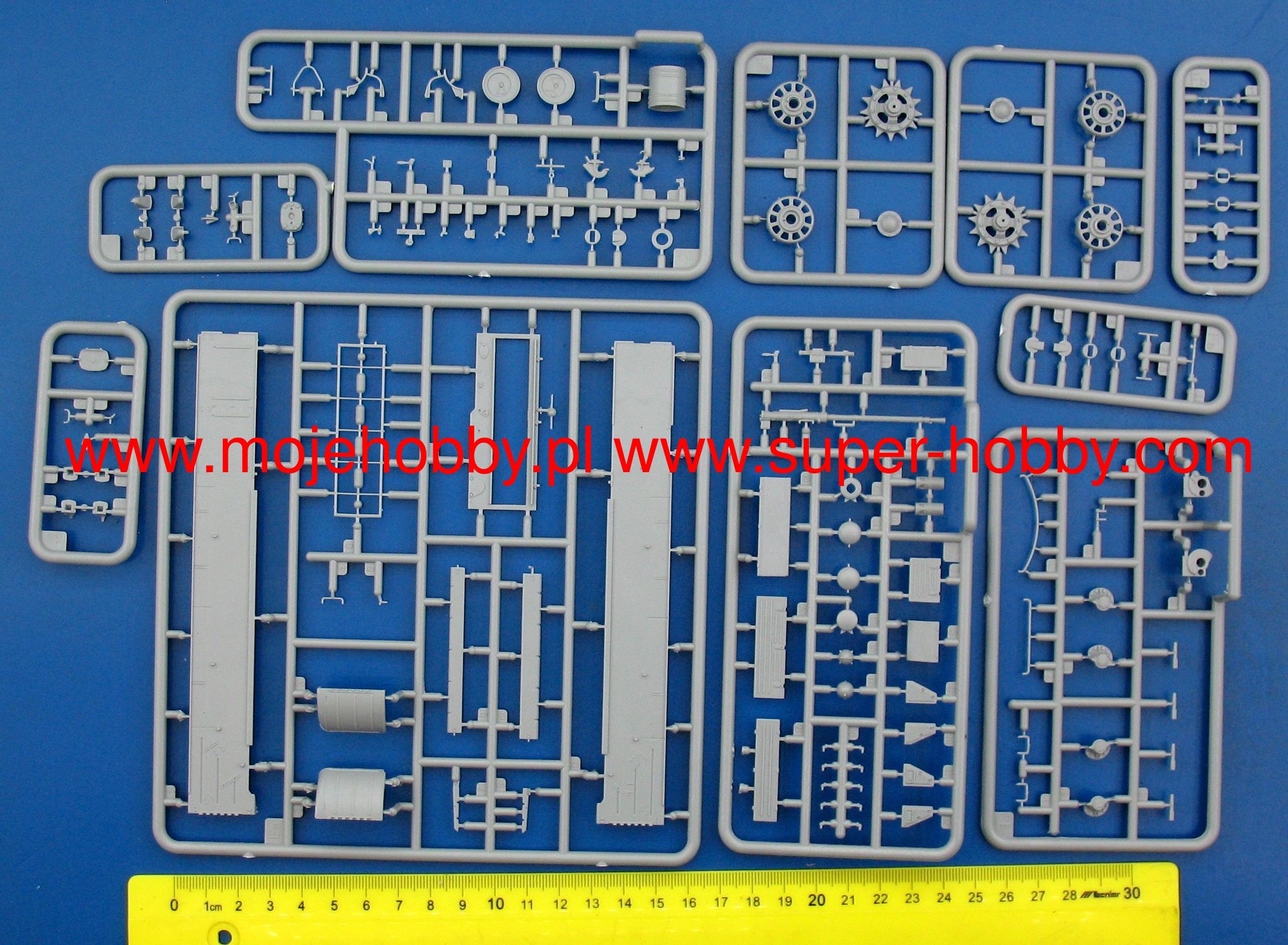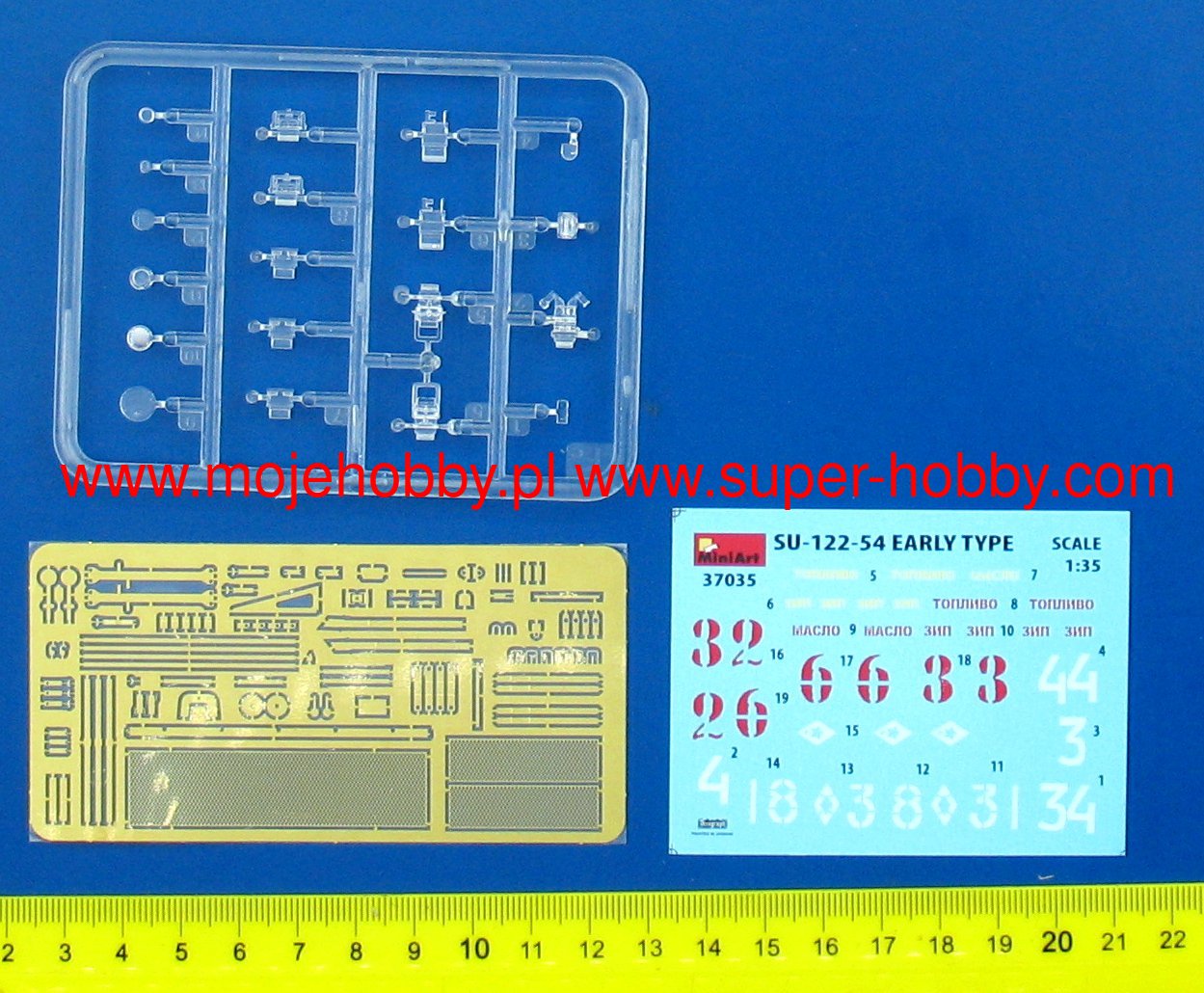 FIRST MODEL OF SU-122-54 EVER REPRODUCED IN PLASTIC ALL HATCHES CAN BE POSED OPEN OR CLOSED SEPARATED OMSh TRACKS 2 TYPES OF IDLER WHEELS AND SPROCKETS PHOTO-ETCHED PARTS INCLUDED CLEAR PARTS INCLUDED DECALS SHEET FOR 3 VARIANTS