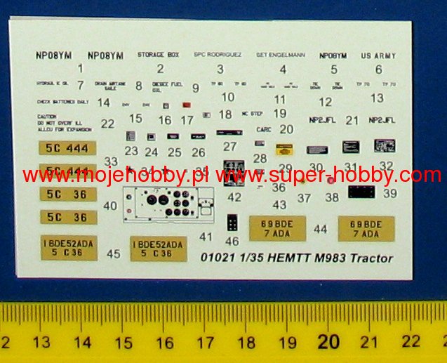 Дополнительная информация M983 тягач, кроме прочих задач использующийся для транспортировки ракетной системы MIM-104 Patriot. Ранний вариант оснащался генератором мощностью 30 KW и краном, установленным позади кабины. M983A2/A4 Light Equipment Transporter (LET) используется преимущественно для транспортировки конструкций и инженерного оборудования. Для загрузки, позади машины, установлена двухскоростная гидравлическая лебёдка 45,000 lbs. (20,430 кг). Длина: 256 мм Ширина: 72 мм Количество деталей: более 380 Фототравления: 1 шт
