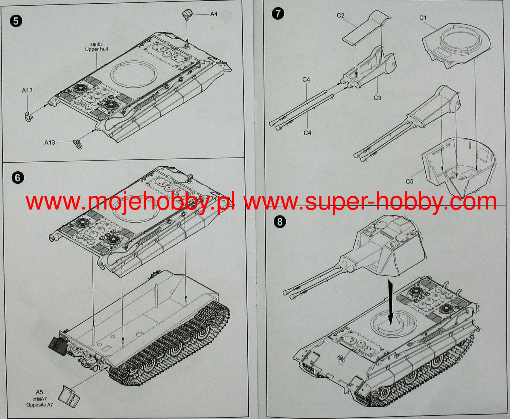 Дополнительная информация Корпус E-50 практически идентичен корпусу King Tiger в габаритных размерах, за исключением макета пластины. Пластины были бы блокированы и свариты, как на других немецких автомобилях, придавая большую прочность и жесткость. Выбранный двигатель был улучшенной версией Maybach HL230 в соответствии с Panther и Tiger II. Названный HL234, он развивал 900 л.с. с использованием впрыска топлива, и ожидается, что он достигнет 1200 л.с. с наддувом. Расположение топливных баков, радиаторов и вентиляторов было похоже на Tiger II. Максимальная скорость должна составлять 60 KPH. Идея заключалась в том, чтобы собрать оба типа на одной и той же производственной линии, используя идентичные производственные механизмы и приводить к сборочным узлам. Длина модели: 132 мм Ширина модели: 535 мм Количество деталей 40+