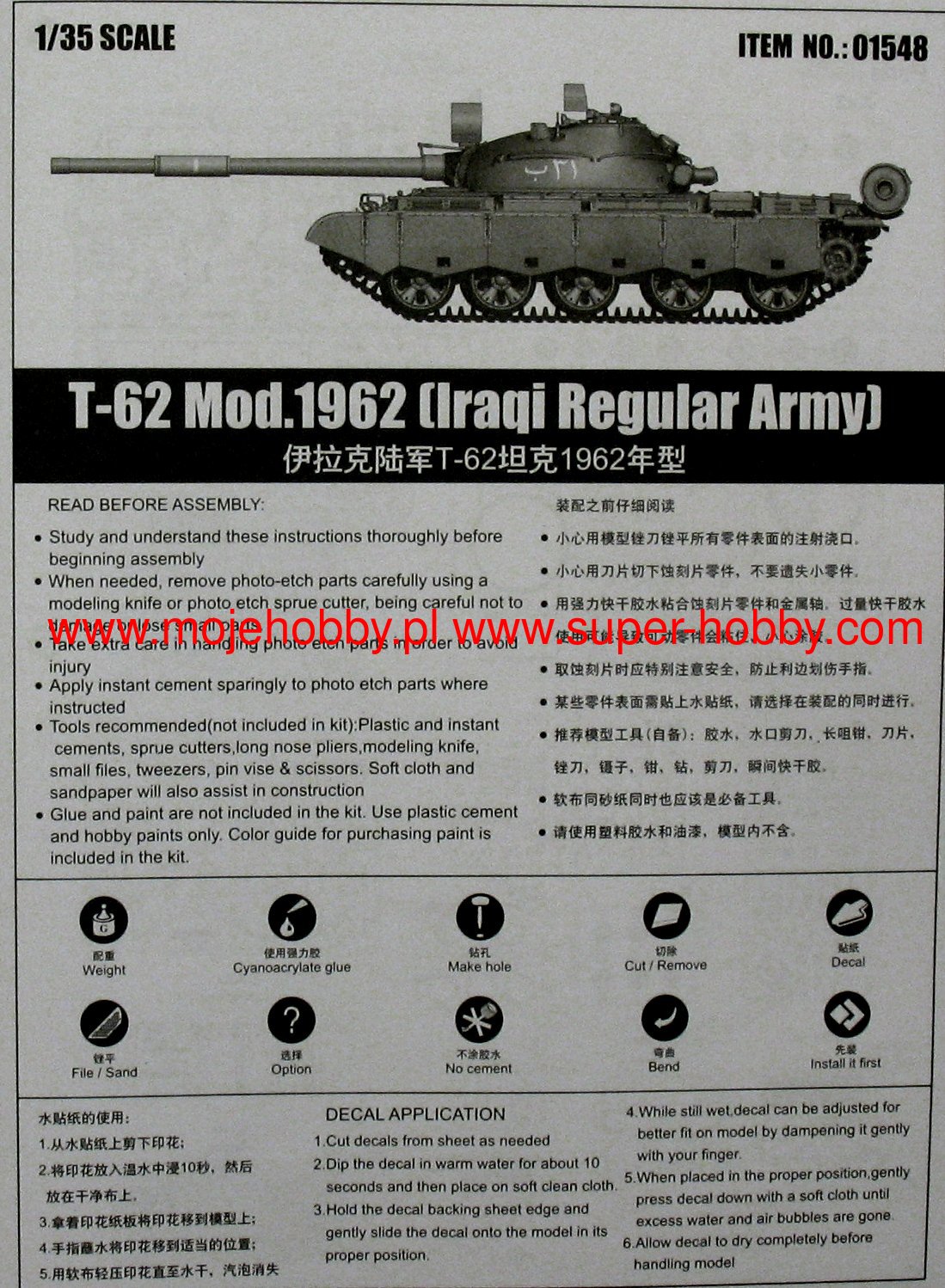 Описание Модификация: Танк-62 образца 1962 года Иракской армии. (в комплект модели входят 3 фигуры иракских танкистов) Размеры собранной модели: Длина: 286мм, Ширина: 95мм, Высота: 76мм Количество деталей: 470+шт. Схемы окраски: Иракская армия 1980-2003гг. Танк-62 (объект 166) советский средний танк. Создан на базе танка Танк-55. Производился в СССР с 1962 по 1975 год. Первый в мире серийный танк с гладкоствольным орудием, и массой среднего танка при высоком уровне бронирования. К созданию Танк-62 привели два направления работ советского танкостроения 1950-х годов по разработке нового вооружения для средних танков и инициативные разработки КБ Ур@лв@гонз@вод@ по созданию перспективного среднего танка для замены Танк-54/55. Разработка танка Танк-62 началась в 1957 году, конструкторским бюро завода № 183 под руководством Л. Н. Карцева. Опытный образец был изготовлен в 1959 году, в 19601961 годах проводились его опытные испытания. Танк-62 представлял собой дальнейшее развитие танка Танк-55, он имел такую же компоновку, и в нем использовались те же узлы и агрегаты, что и на танке Танк-55. 12 августа 1961 года танк был принят на вооружение. Серийное производство Танк-62 велось в СССР с 1962 по 1973 год, всего выпущено около 20000 единиц всех модификаций. Танк поставлялся за рубеж с начала 1970-х годов. Первое применение Танк-62 в бою состоялось в советско-китайском пограничном конфликте на острове Даманский в марте 1969 года., с тех пор танк принимал участие во многих конфликтах и войнах и продолжает использоваться в настоящее время. Танк-62 имеет классическую компоновку, с размещением моторно-трансмиссионного отделения в кормовой, отделения управления в передней части, а боевого отделения в средней части машины. Пушечное вооружение Танк-62 составляет 115-мм гладкоствольная полуавтоматическая пушка У-5ТС (2А20). Боекомплект составляет 40 унитарных выстрелов с подкалиберными бронебойными, кумулятивными и осколочно-фугасными снарядами. В спаренной установке с пушкой размещается 7,62-мм пулемёт. На танках ранних выпусков устанавливался пулемёт СГМТ, с августа 1964 года сменённый более совершенным ПКТ. В качестве зенитного на некоторых модификациях Танк-62 может используется 12,7-мм пулемёт ДШКМ обр.1938/46 гг. Танк имеет дифференцированное противоснарядное бронирование. На Танк-62 установлена система противоатомной защиты, обеспечивающая защиту экипажа танка от избыточного давления, создаваемого ударной волной ядерного взрыва, и от проникновения радиоактивной пыли внутрь танка На Танк-62 устанавливался V-образный 12-цилиндровый дизельный двигатель жидкостного охлаждения В-55В, мощностью 580л.с. Экипаж танка состоит из четырёх человек: механика-водителя, командира, наводчика и заряжающего.
