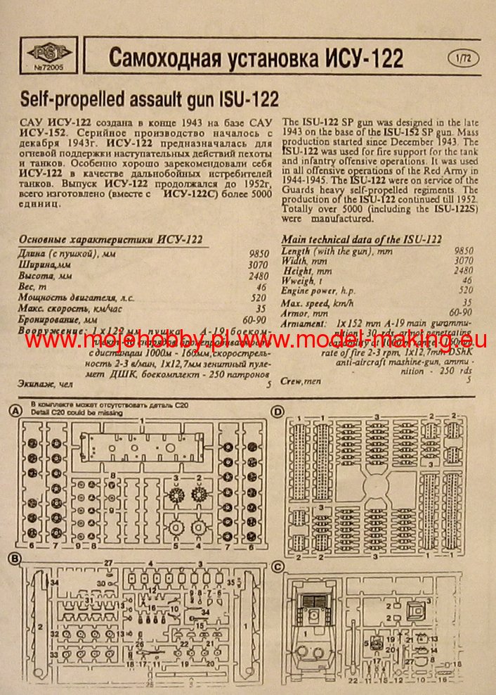 Дополнительная информация В апреле 1944 года, спустя несколько месяцев после запуска ИСУ-122 в серийное производство, от НКТП поступило распоряжение провести модернизацию ИСУ-122 путем удаления из состава экипажа замкового и повышения автоматизации работы с орудием. Доработками занимались специалисты завода №100, которые решили адаптировать существующую конструкцию под установку пушки Д-25С оснащенная дульным тормозом. Этот выбор был хорош тем, что аналогичная пушка имелась у тяжелого танка ИС-2 таким образом проводилась унификация вооружения и исчезала проблема с подбором боеприпасов. Длина ствола Д-25С составляла 48 калибров, высота линии огня 1795 мм. Обновленная САУ обозначалась как Объект 249 (также использовалось название ИСУ-122-2) и поступила на войсковые испытания на Гороховецкий полигон 5 июня 1944 года. По сравнению с серийной ИСУ-122 опытный образец самоходки был на 450 кг легче и обладал рядом эксплуатационных преимуществ. Установка нового орудия с клиновым полуавтоматическим затвором и электроспуском существенно облегчала процесс стрельбы. Отказ от замкового давал больше свободного пространства внутри боевого отделения, но темп стрельбы при этом снижался до 3,5 выстрелов в минуту. Правда, в издании “Тяжелые САУ Красной Армии” (из серии “Бронеколлекция МК”) утверждается, что максимальная скорострельность пушки повысилась до 6 выстрелов в минуту. Параметры вертикального и горизонтального наведения были аналогичны А-19C. Прицеливание осуществлялось при помощи телескопического прицела ТШ-17 и панорамы Герца. Прицельная дальность стрельбы у Д-25С была выше, чем у А-19C, и составляла 5000 метров (максимальная 15000 метров). В предъявленном виде САУ удовлетворила требования заказчика и, после незначительных доработок, 22 августа 1944 года она была принята на вооружение РККА под обозначением ИСУ-122С. Предполагалось, что улучшенная самоходка заменит более ранний вариант ИСУ-122, но на самом деле выпуск обоих машин шёл параллельно. Произошло это потому, что завод №9 оказался перегружен заказами по выпуску орудий Д-10 и Д-25Т, в связи с чем значительно увеличить производство Д-25С в ближайшее время не представлялось возможным. В итоге, ИСУ-122С оказались в “численном меньшинстве” и их выпуск производился небольшими партиями. В период с 1944 по 1945 гг. было построено 1735 самоходных установок ИСУ-122 и 675 ИСУ-122С.