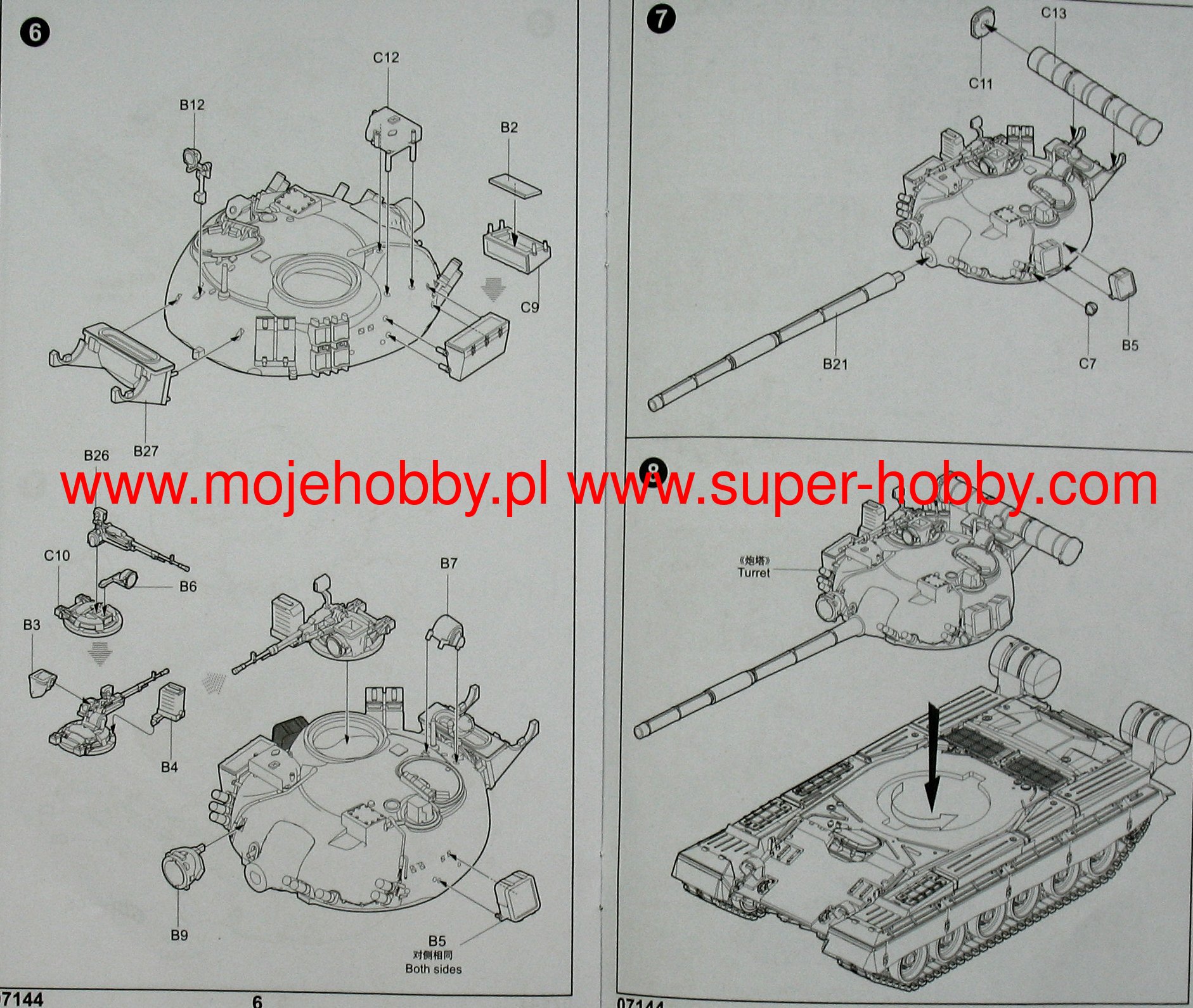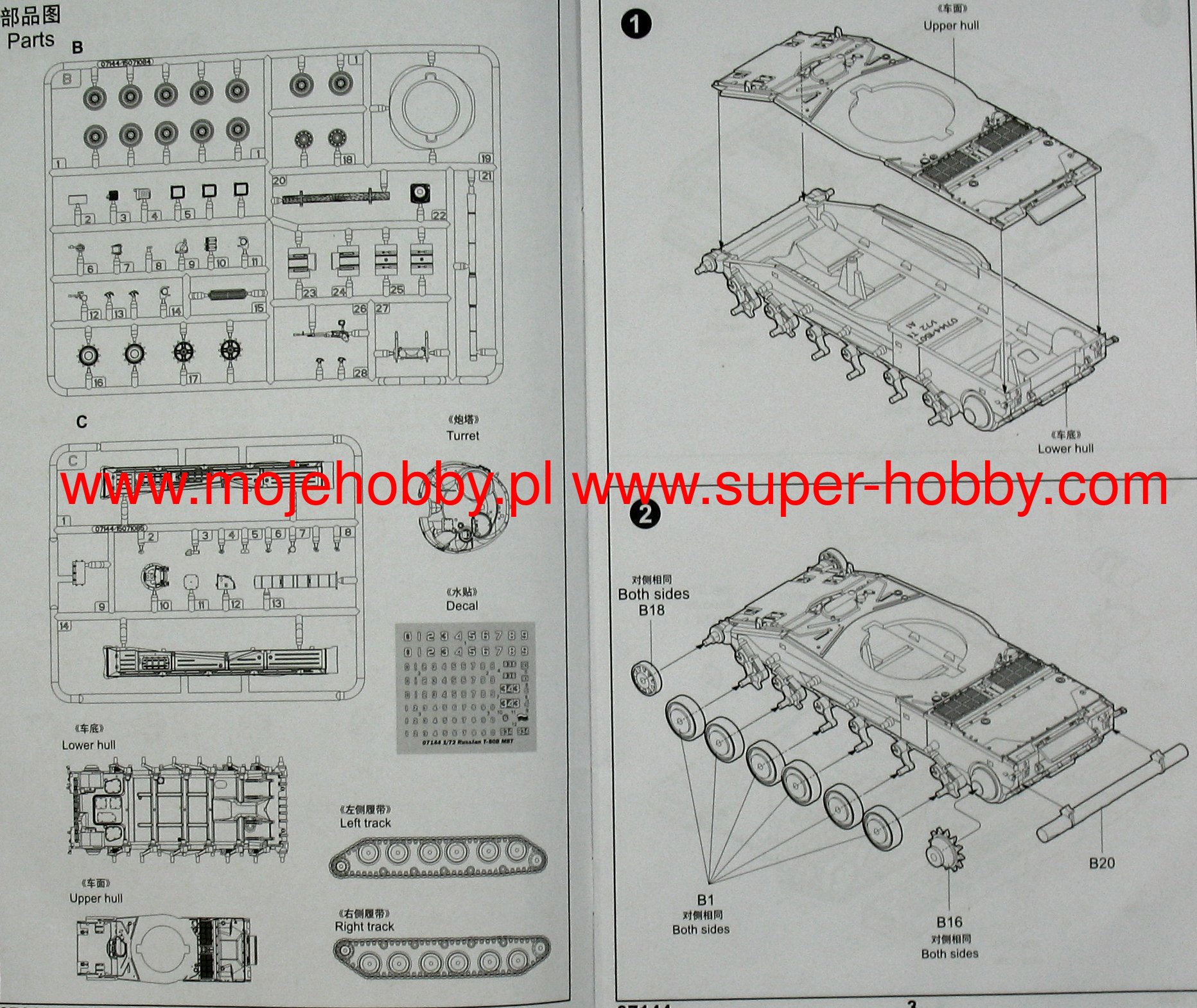 Описание Модификация: Танк-80Б образца 1978 года. Размеры собранной модели: Длина: 134мм, Ширина: 49мм, Высота: 31мм Количество деталей: 40+шт. Схемы окраски: Советская Армия Российская Армия Танк-80 семейство послевоенных советских основных боевых танков(ОБТ), разработанное на базе танка Танк-64. Первый в мире серийный танк с газотурбинным двигателем(ГТД) Танк-80Б принят на вооружение в 1978 году. Принципиальным отличием от Танк-80 стало применение новой пушки и комплекса управляемого ракетного вооружения 9К112-1 "Кобра" с радиоуправляемой ракетой 9М112. С пушкой спарен пулемет ПКТ калибра 7,62-мм. Для стрельбы по воздушным целям имеется зенитный пулемет НСВТ калибра 12,7-мм, установленный на основании люка командира танка. Боевое отделение по компоновке подобно боевому отделению танка Танк-64Б. Кроме 28 выстрелов в механизированной боеукладке, в пределах боевого отделения находятся три выстрела (7 снарядов и заряды к ним размещены в отделении управления). Кроме усовершенствованного вооружения, Танк-80Б имел и более мощную броневую защиту. Лобовая часть корпуса и башни представляет собой многослойные комбинированные преграды, остальное бронирование корпуса и башни монолитная стальная броня, с большим дифференцированием толщин и углов наклона. В 1980 году Танк-80Б получил новый двигатель ГТД-1000ТФ, мощность которого возросла до 1100 л. с. Он приспособлен для работы на реактивных топливах, дизельных топливах и автомобильных низкооктановых бензинах. Танк имеет классическую схему общей компоновки с отделением управления спереди, боевым отделением в центре и моторно-трансмисионным отделением сзади. Боевая масса 42,5 т. Экипаж три человека.