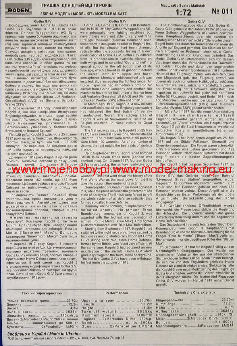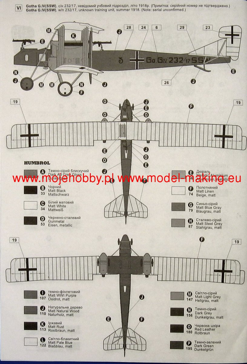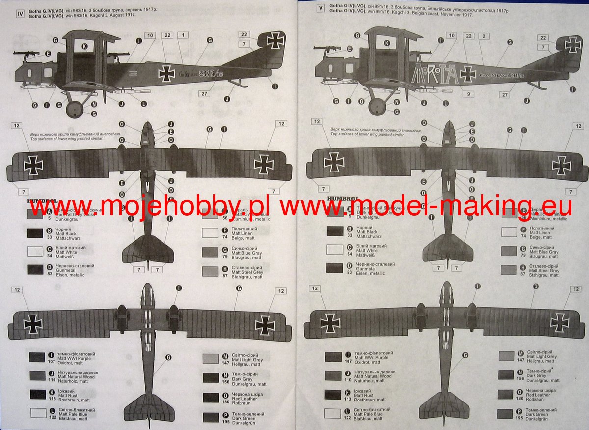 The Gotha G.IV is a German, two-engine, two-plane heavy bomber of a mixed construction from the First World War period with a crew of three. The "fathers" of the aircraft were engineers Oskar Ursinus and Helmut Friedel, and the G.IV aircraft was created as a result of an order by the German aviation for a heavy bomber plane. The flight of the prototype, very much modeled on the Friedrichshafen G.III plane, took place in 1916 and at the end of that year it entered linear units. The first combat use of the new machine took place in February 1917, during an air raid over England. In the same year, they also took part in Operation Türkenkreuz - a strategic bombing of London. In 1918, planes also bombed London and Paris. During the war, 230 copies were produced. Technical data: length: 12.3 m, wingspan: 23.7 m, height: 4.3 m, maximum speed: 135 km / h, climb speed: 4.2 m / s, maximum range: 700 km, maximum ceiling 5000 m, armament: permanent -2 7.92mm Spandau machine guns, underslung - up to 500 kg of bombs.