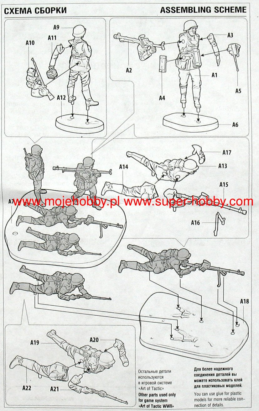 Сборные солдатики - Немецкие бронебойщики. Набор является частью расширяемой игровой системы Art of Tactic Вторая Мировая, состоящей из множества различных наборов военной техники, солдат и авиации. Основа игровой системы это базовый стартовый набор Вторая Мировая, в котором вы найдёте подробные правила игры, игровые поля, дополнительные игровые аксессуары и различные сценарии. Вы можете увеличивать свою армию, разыгрывать сценарии и совершенствовать тактику. Набор деталей для сборки 4-х неокрашенных фигур. Состав набора: 4 неокрашенные фигуры флаг отряда инструкция по сборке Карточку с игровыми характеристиками отряда вы найдете на этой странице в разделе "СХЕМА СБОРКИ И ОКРАСКИ" Сборка осуществляется без использования клея.