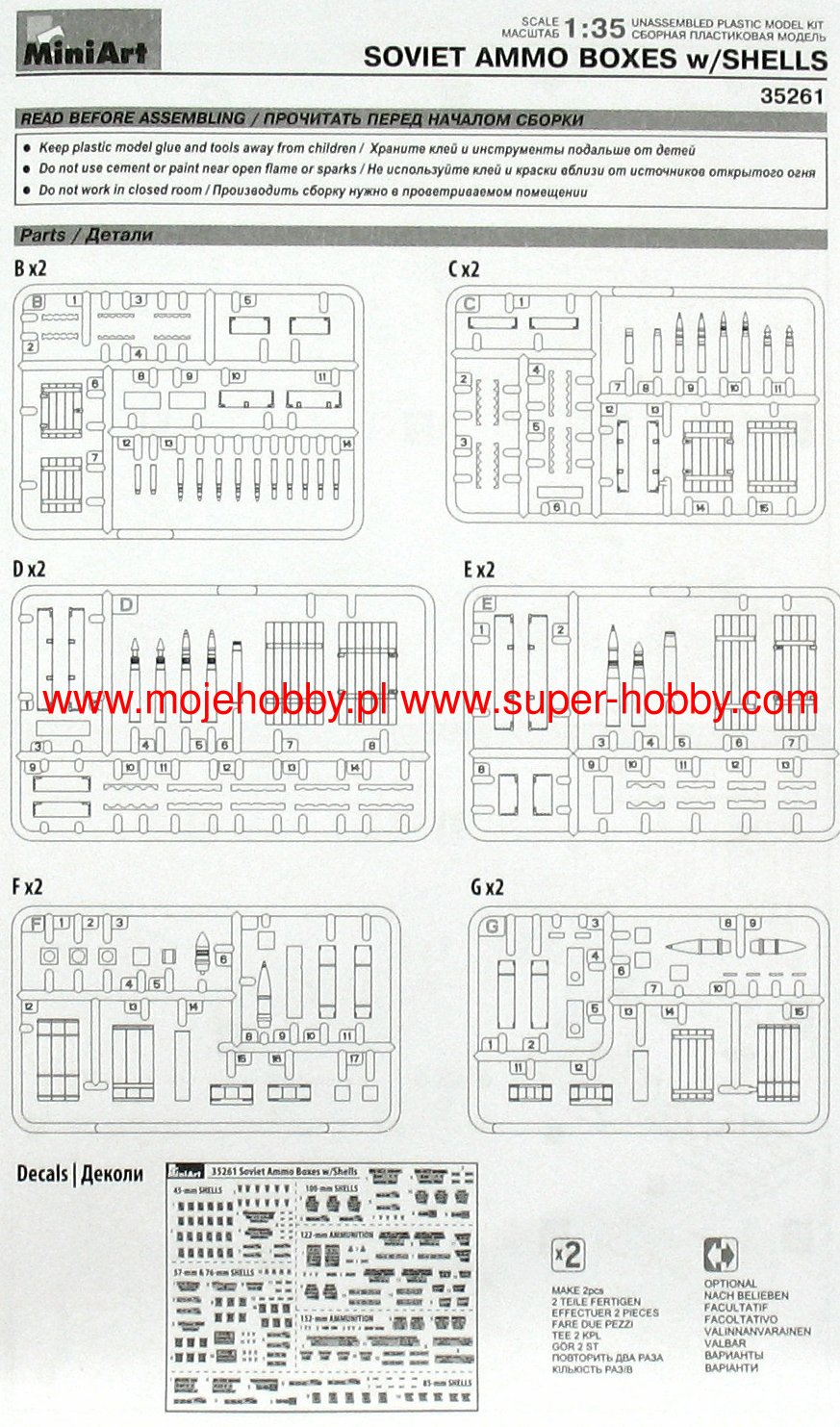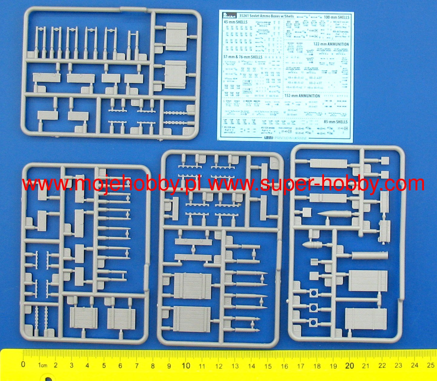 Kit contains 254 details for assembling model of Soviet Ammo Boxes with Shells.