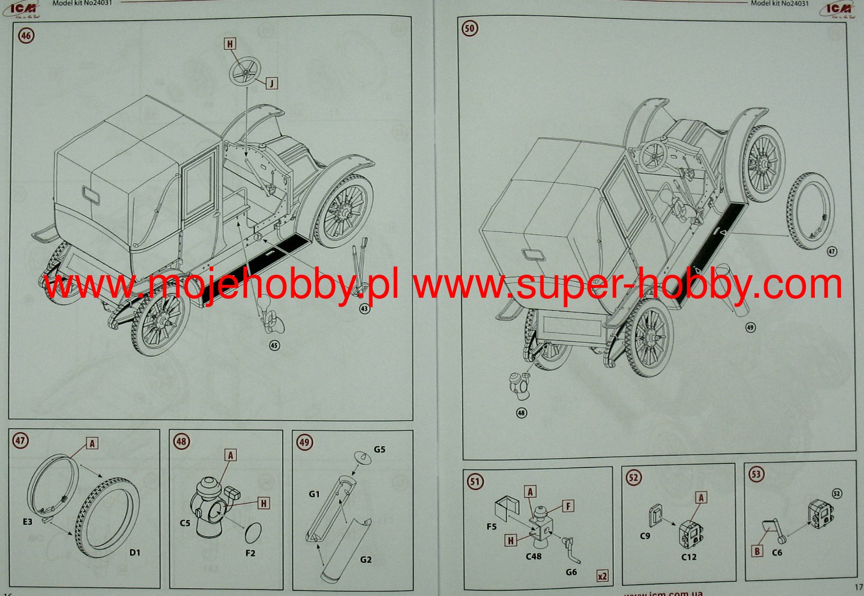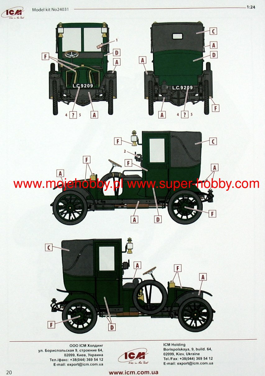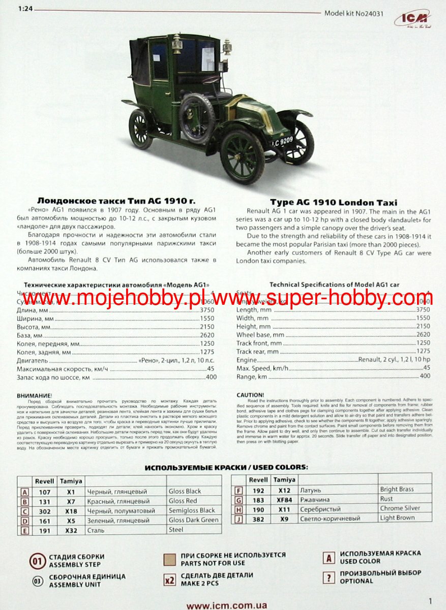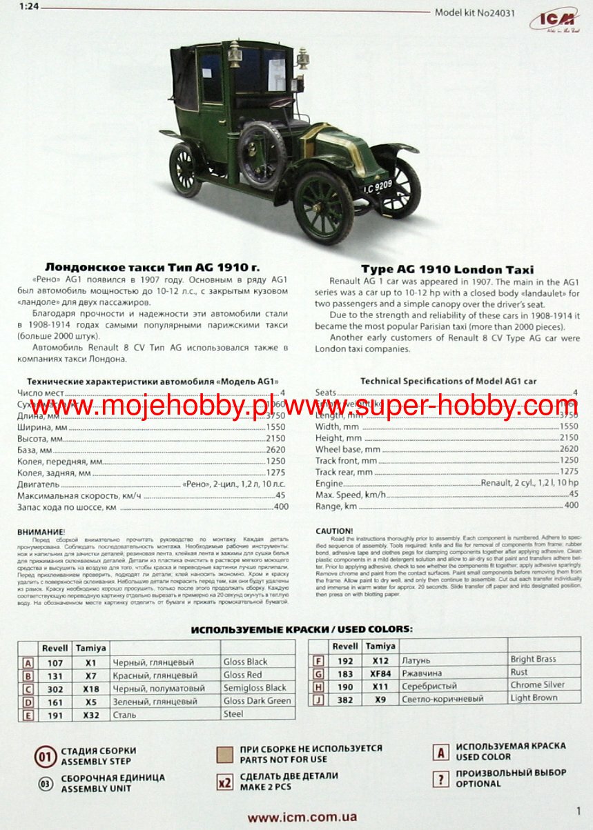 Данный набор предлагает собрать модель лондонского такси образца 1910 года на базе французского автомобиля AG-1 марки Рено. Renault AG-1 - легковой автомобиль переднемоторной заднеприводной компоновки в двухдверном кузове "торпедо", выпускался с 1905 по 1910 годы. 1,2-литровый бензиновый двигатель мощностью 9 лошадиных сил позволял автомобилю развивать максимальную скорость до 65 км/ч. Длина модели 155 мм, высота 98 мм, 103 детали. Внимание! Клей и краски в комплект не входят. Масштаб: 1/24 Размер: 15,5 см Количество деталей: 103 шт. Сложность: Средне