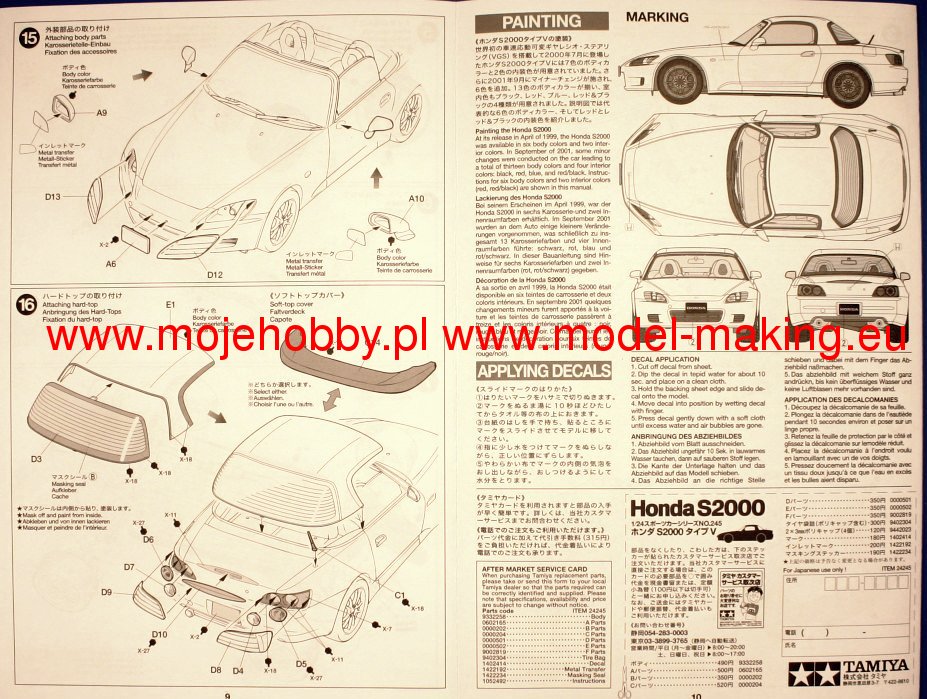 ОПИСАНИЕ ТОВАРА Набор пластиковых элементов для сборки модели автомобиля Honda S2000 (модельный ряд 2001). Модель имеет высокую степень детализации с множеством конструктивных подробностей. Покрышки из синтетической резины. Металлические самоклеящиеся элементы зеркал, эмблемы и надписи. Сборка элементов осуществляется при помощи специального клея. Внимание! Клей и краски в комплект не входят.