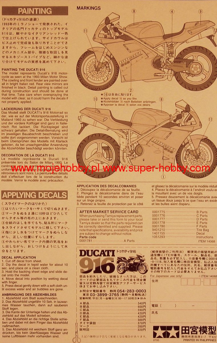 ОПИСАНИЕ ТОВАРА Набор пластиковых элементов для сборки модели мотоцикла Ducati 916. Особенности модели: Высокодетализированный двигатель жидкостного охлаждения. Покрышки из резиноподобного пластика с точно воспроизведенным рисунком протектора. Поворотная передняя вилка. Приводы тормозов и сцепления. Сборка элементов осуществляется при помощи специального клея. Внимание! Клей и краски в комплект не входят.