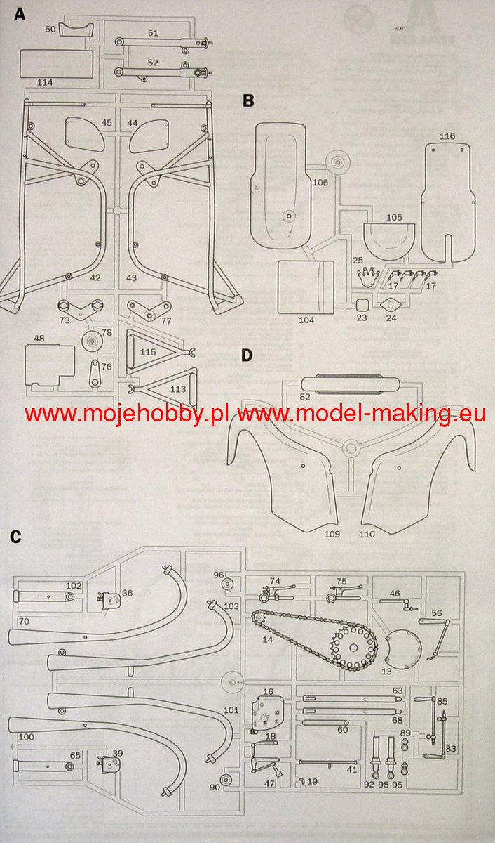 This Cardan-transmission motorcycle, first built in 1950, reached a peak of reliability and competitiveness in 1956 when it adopted chain transmission and a telescopic front fork. The 500 cc 4-cylinder MV Agusta was ridden by the worlds most famous racers - J. Surtees, M. Hailwood, G. Hocking and G. Agostini. Thanks to them this near-unbeatable motorcycle dominated the 500 cc category from 1956 to 1965, winning 9 world titles. It continued competing until 1966 when it was retired to make way for a new, lighter, more manageable 3-cylinder motorcycle.The model, pre-moulded in the original colours and with chrome-plated parts, alsofeatures working suspension and rubber tyres.