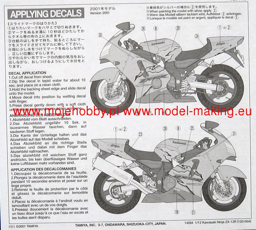 ОПИСАНИЕ ТОВАРА Набор пластиковых элементов для сборки модели мотоцикла Kawasaki Ninja ZX-12R. Особенности модели: Высоко детализированный 4-тактный двигатель, алюминиевая рама и прозрачный пластиковый обтекатель. Поворотная передняя вилка. Цельные покрышки из синтетической резины. Сборка элементов осуществляется при помощи специального клея. Внимание! Клей и краски в комплект не входят.