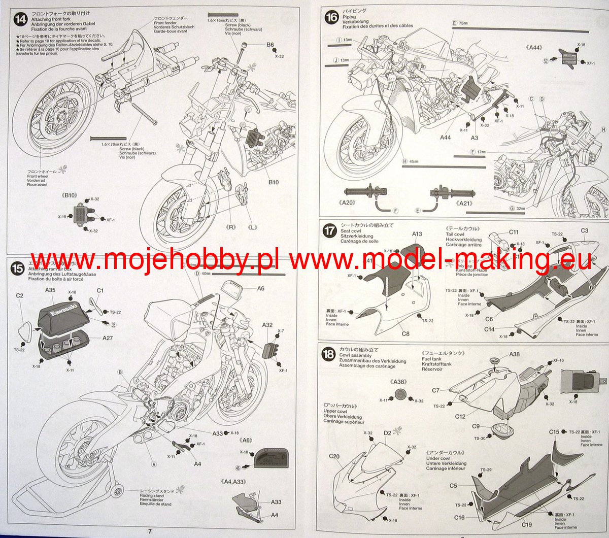 ОПИСАНИЕ ТОВАРА Набор пластиковых элементов для сборки модели мотоцикла Kawasaki Ninja ZX-RR. Особенности модели: Высокодетализированный 4-цилиндровый рядный 4-тактный 990-кубовый двигатель жидкостного охлаждения. Съемные обтекатели для обзора двигателя. Покрышки из синтетической резины. Поворотная передняя вилка. Виниловая трубка для приводов тормозов и сцепления. Детали обтекателя выполнены 2 деталями (верхняя и нижняя части) из прозрачного пластика лайм-зеленого цвета. Сборка элементов осуществляется при помощи специального клея. Внимание! Клей и краски в комплект не входят.