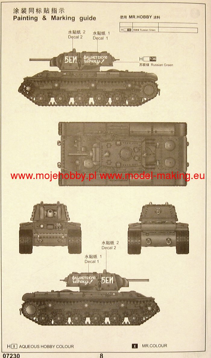 Описание Модификация: КВ-1 обр. 1941г., выпуска ЛКЗ(Ленинградский Кировский Завод), с дополнительными броневыми экранами. Размеры собранной модели: Длина: 90мм, Ширина: 46мм, Высота: 39мм Количество деталей: 106шт. КВ-1 (названный в честь Климента Ворошилова, как и остальные танки серии КВ) советский тяжёлый танк времён Великой Отечественной войны. Обычно называется просто КВ: танк создавался под этим именем, и лишь позже, после появления танка КВ-2, КВ первого образца ретроспективно получил цифровой индекс. Выпускался на ЛКЗ и ЧКЗ с августа 1939 года по август 1942 года, всего было выпущено 3163 КВ-1 и 102 огнеметных КВ-8. Принимал участие в войне с Финляндией и Великой Отечественной войне. КВ стал родоначальником целой серии тяжёлых танков и САУ. На танках КВ-1 первых выпусков устанавливалась пушка Л-11 калибра 76,2 мм с боекомплектом 111 выстрелов, впоследствии пушку Л-11 заменили на 76-мм орудие Ф-32 с аналогичной баллистикой, а осенью 1941 года на орудие ЗИС-5 с большей длиной ствола в 41,6 калибра. Для ведения огня КВ-1 оснащался двумя орудийными прицелами телескопическим ТОД-6 для стрельбы прямой наводкой и перископическим ПТ-6для стрельбы с закрытых позиций. На серийном танке КВ-1 устанавливались три 7,62-мм пулемёта ДТ: спаренный с орудием, а также курсовой и кормовой в шаровых установках. Боекомплект ко всем ДТ составлял 2772 патрона. Эти пулемёты монтировались таким образом, что при необходимости их можно было снять с монтировок и использовать вне танка. Также для самообороны экипаж имел несколько ручных гранат Ф-1 и иногда снабжался пистолетом для стрельбы сигнальными ракетами. На каждом пятом КВ монтировали зенитную турель для ДТ, однако на практике зенитные пулемёты ставили редко. КВ-1 оснащался четырёхтактным V-образным 12-цилиндровым дизельным двигателем В-2К мощностью 500 л. с. (382 кВт) при 1800 об/мин, впоследствии мощность двигателя довели до 600 л. с. (441 кВт). Трансмиссия механическая, все приводы управления трансмиссией механические. При эксплуатации в войсках наибольшее число нареканий и рекламаций в адрес завода-изготовителя вызывали именно дефекты и крайне ненадёжная работа трансмиссионной группы, особенно у перегруженных танков КВ выпуска военного времени. Подвеска машины индивидуальная торсионная с внутренней амортизацией для каждого из 6 двускатных опорных катков малого диаметра по каждому борту. Напротив каждого опорного катка к бронекорпусу приваривались ограничители хода балансиров подвески. Ведущие колёса со съёмными зубчатыми венцами цевочного зацепления располагались сзади, а ленивцы спереди. Верхняя ветвь гусеницы поддерживалась тремя малыми обрезиненными поддерживающими катками по каждому борту. Механизм натяжения гусеницы винтовой; каждая гусеница состояла из 8690 одногребневых траков шириной 700 мм и шагом 160 мм.