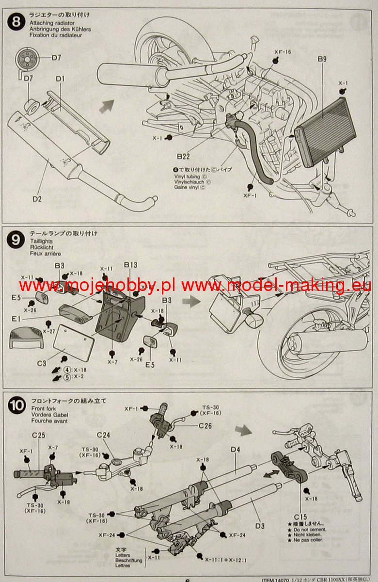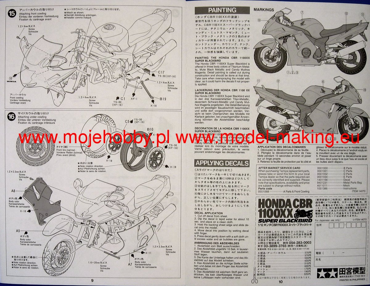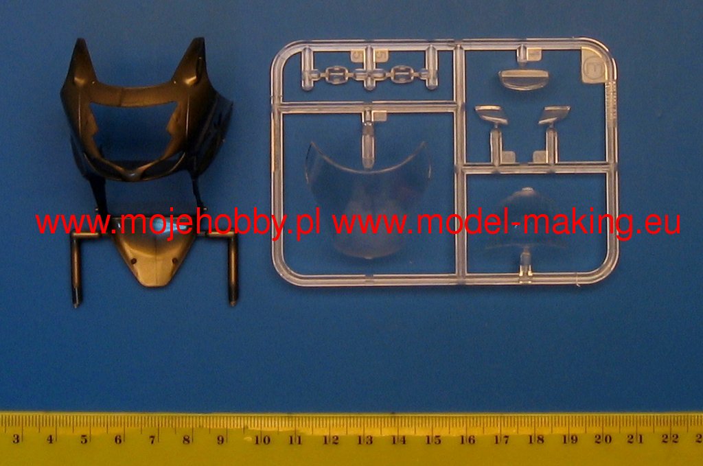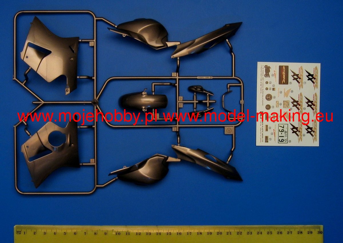 ОПИСАНИЕ ТОВАРА Набор пластиковых элементов для сборки модели мотоцикла Honda CBR 1100XX S. Blackbird. Особенности модели: Высокодетализированный 4-цилиндровый двигатель жидкостного охлаждения. Покрышки из резиноподобного пластика с точным рисунком протектора. Поворотная передняя вилка. Приводы тормозов и сцепления. Глушители, отражатель фары, элементы зеркал с блестящим металлическим напылением. Сборка элементов осуществляется при помощи специального клея. Внимание! Клей и краски в комплект не входят.