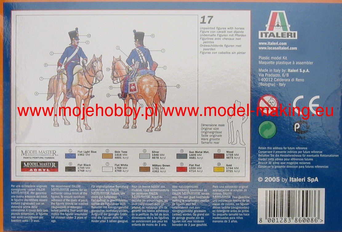 The word “hussar” identifies the light horsemen and comes from the Hungarian “huszar”. The most famous hussar units were the French regiments of the Napoleonic era. They were employed for scouting and communication purposes, and to screen the movement of the Emperor's corps, like during the advance that allowed the French to flank the Austrian general Mack at Ulm in 1805. The soldiers in this kit wear the uniform of the 1st Hussars employed at Jena in 1806, and they are characterized by the ornate Hungarian style uniform, sabretache, sabre and carbine.