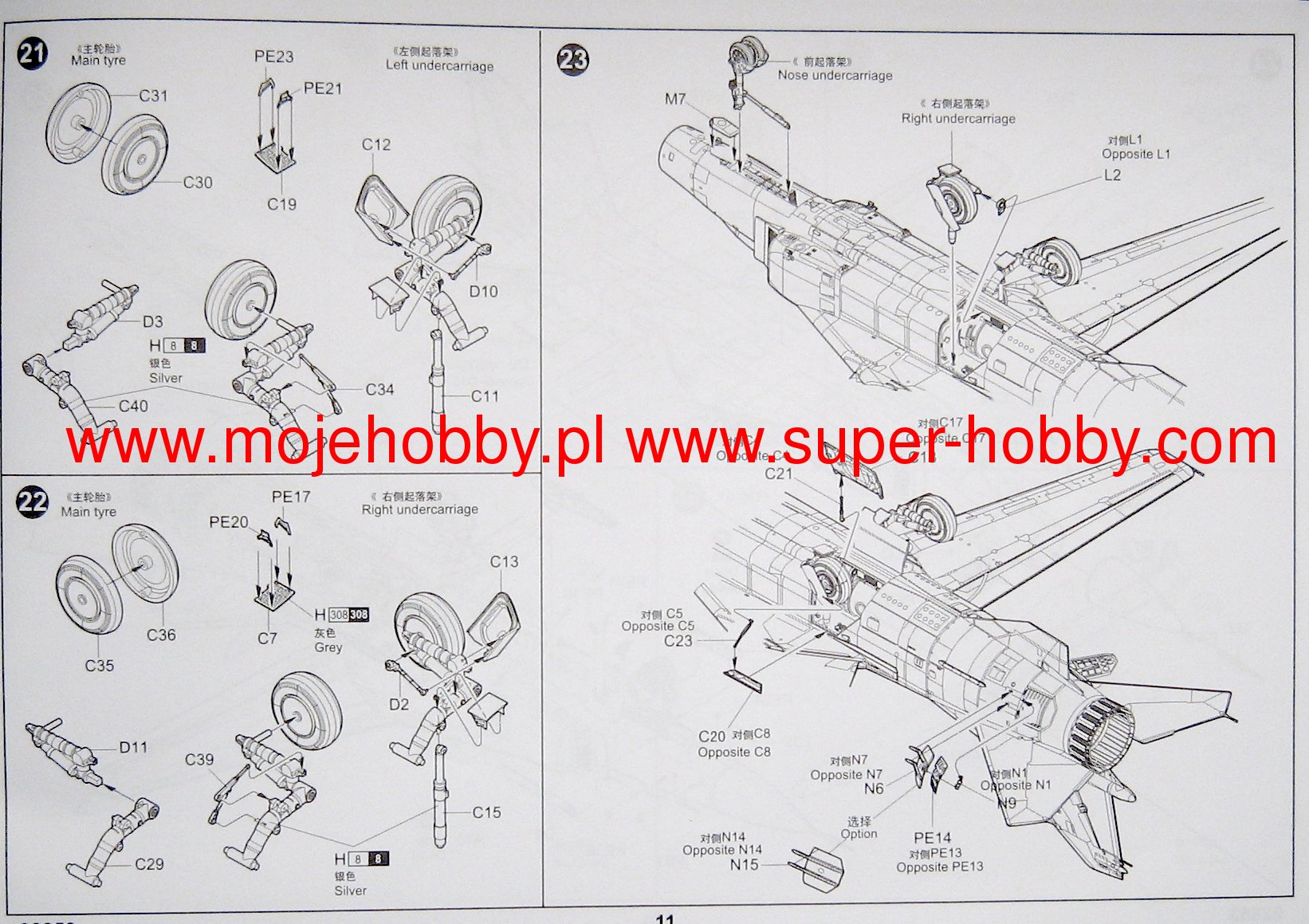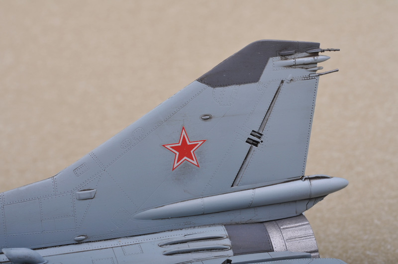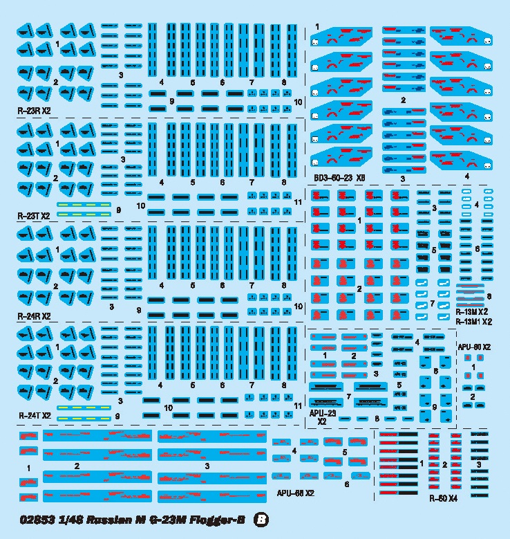 Описание М&Г-23 (по кодификации НАТО: Flogger Бичеватель) советский многоцелевой истребитель третьего поколения с верхним расположением крыла изменяемой стреловидности разработки ОКБ-155. Первый полёт на опытном самолёте 23-11 выполнил 10 июня 1967 года лётчик-испытатель А. В. Федотов. М&Г-23М, 23-11М, изд. 2М - Самолёт с крылом третьей редакции с отклоняемым носком и двигателем Р-27Ф2М-300 (или более мощным Р-29-300 изделие 55 с тягой 11500 кг). Оборудовался системой командного наведения Лазурь-СМ, РЛС С-23С (РП-23, позже с РЛС Сапфир-23Д), оптическим коллиматорным прицелом АСП-23Д, теплопеленгатором ТП-23, что позволило применять УР средней дальности Р-23Р (радиолокационная полуактивная система наведения) и Р-23Т (ИК самонаведение), а также УР с ИК самонаведением малой дальности К-13М. Серия с 1972 года на заводе № 30 (по 23-ю серию). На базе изделия 2М с 1973 года тридцатым заводом строилась экспортная модификация изделие 2МС с упрощённым БРЭО (РЛС РП-22 Сапфир-21), УР Р-13 и Р-3. С 1974 года по 1976, начиная с самолёта № 2304, на самолёты изделия 2М ставились РЛС Сапфир-23Д-III и АСП-17. Длина: 365,9 мм Размах крыльев: 290,3 мм Всего деталей 260+ Фототравление