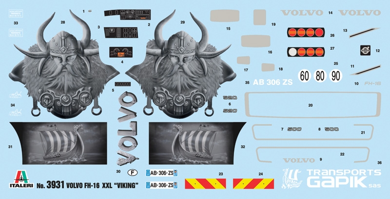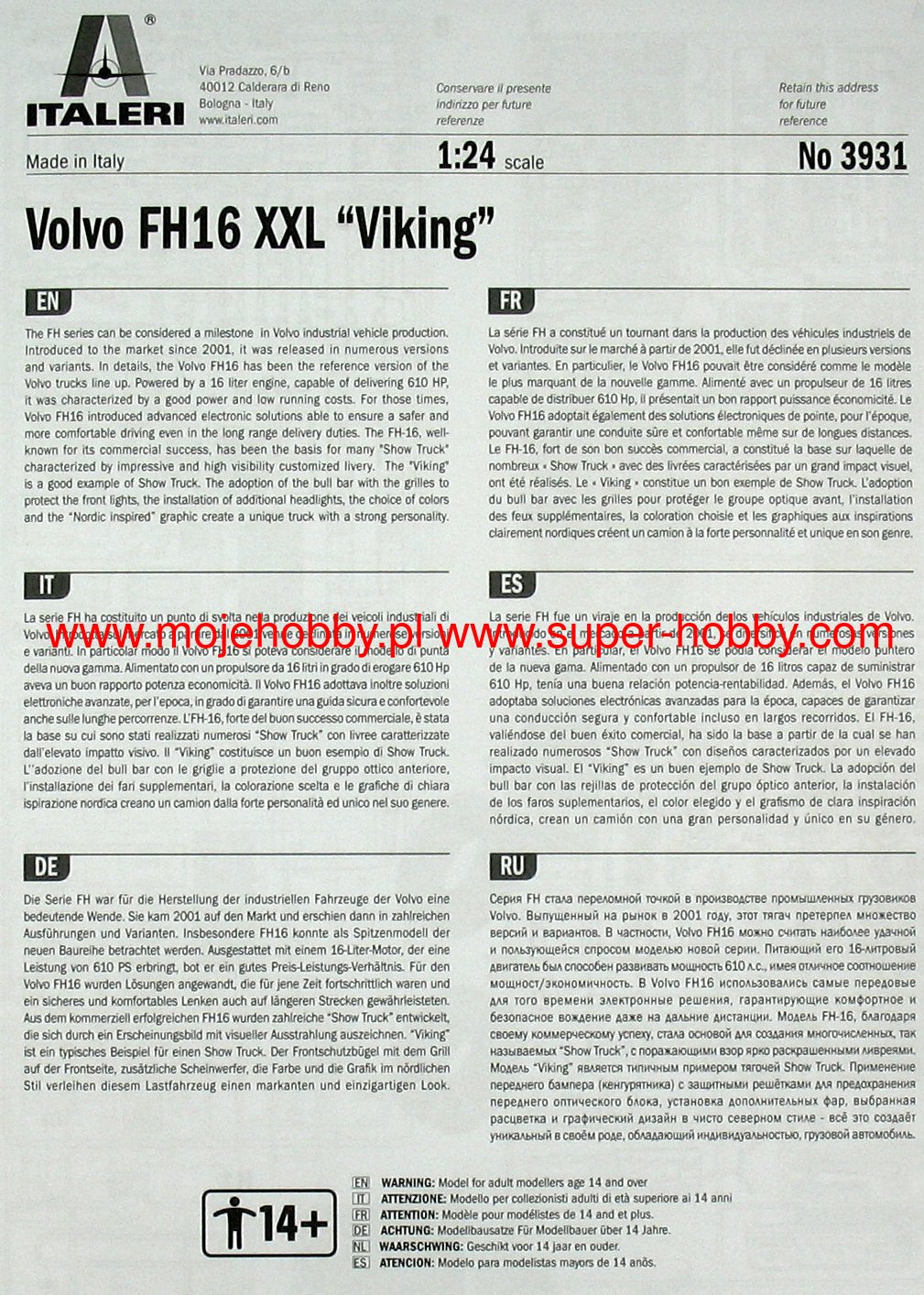 ADDITIONAL CROMED PARTS - NEW TYRES - CHROMED WHEEL RIMSThe FH series can be considered a milestone in Volvo industrial vehicle production. Introduced to the market since 2001, it was released in numerous versions and variants. In details, the Volvo FH16 has been the reference version of the Volvo trucks line up. Powered by a 16 liter engine, capable of delivering 610 HP, it was characterized by a good power and low running costs. For those times, Volvo FH16 introduced advanced electronic solutions able to ensure a safer and more comfortable driving even in the long range delivery duties. The FH-16, well-known for its commercial success, has been the basis for many "Show Truck" characterized by impressive and high visibility customized livery. The "Viking" is a good example of Show Truck. The adoption of the bull bar with the grilles to protect the front lights, the installation of additional headlights, the choice of colors and the “Nordic inspired” graphic create a unique truck with a strong personality.